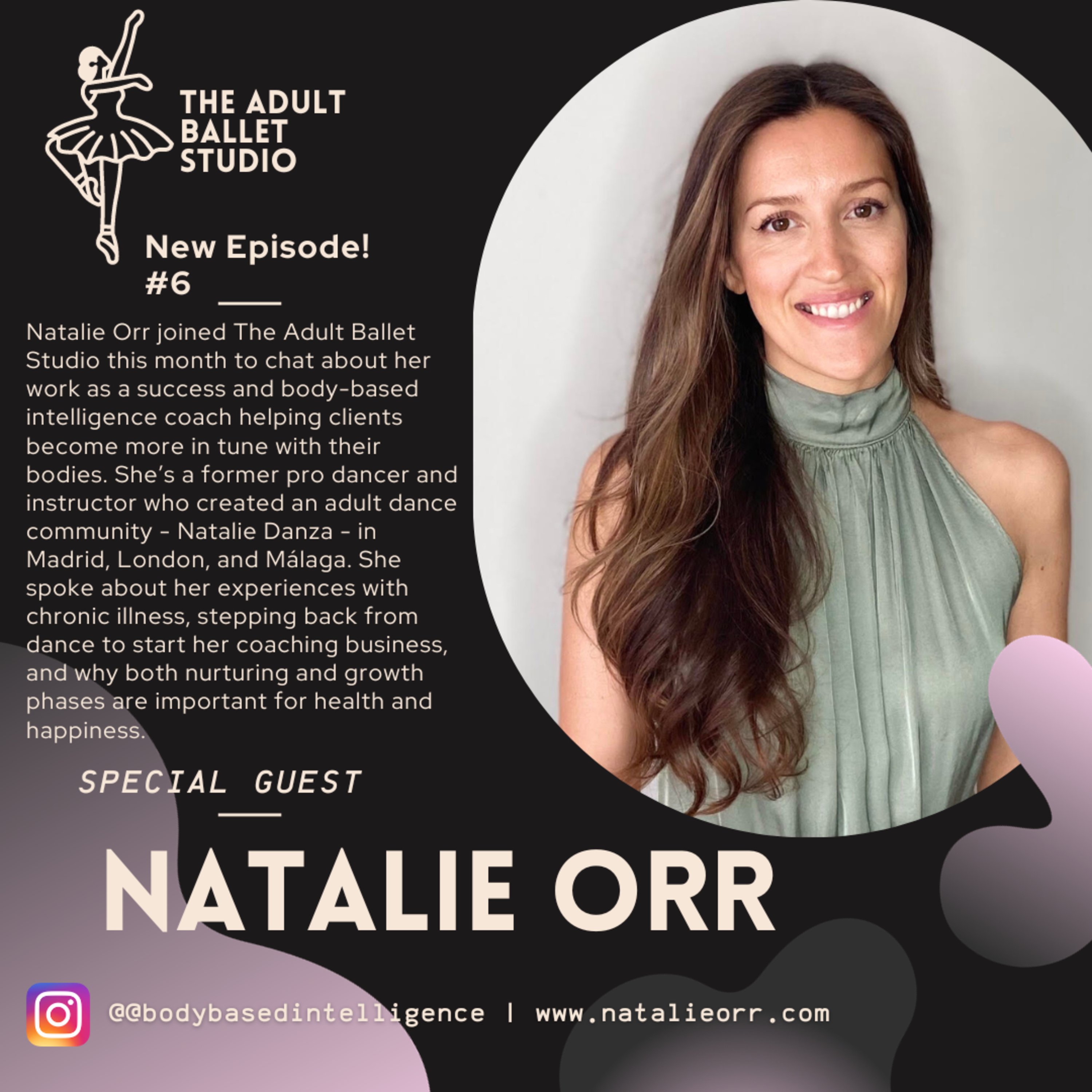 Happy new year! Natalie Orr, body-based intelligence coach and former professional dancer and instructor, is in the studio this month to talk about dance, embodiment, chronic illness, and more! She has more than 16 years of teaching experience both as a dance teacher and an English as a foreign language teacher. She taught in Madrid for many years and created an online dance movement for adults called Natalie Danza, where she ran classes, workshops and retreats in London, Madrid, and Málaga. For the past four years, she’s taken a step back from dancing to run a success coaching business where she helps clients become more in tune with their bodies. We spoke about her decision to take a break from dance, as well as her experience being diagnosed with endometriosis and the challenges of being a person who menstruates or has a woman’s body in ballet. She shared her advice for adult dancers to focus on nurturing their bodies as well as growth and why both are important. We also discussed why dancers need to be more careful about balancing their hard work and perfectionism with periods of rest and kindness to their bodies.