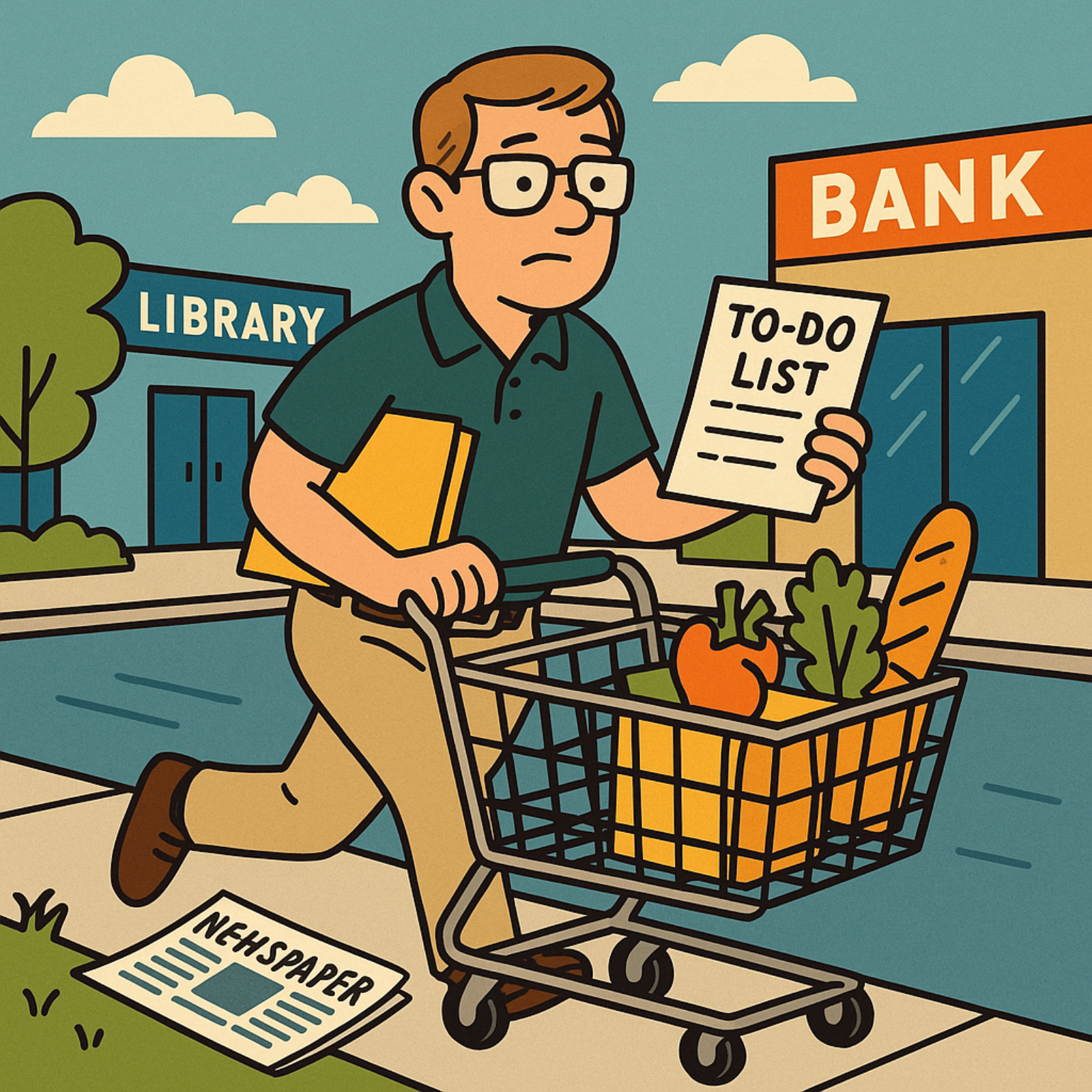 I've had a really busy day today. I rolled out of bed at around 7:00 AM, like every morning, and jumped in the shower. After brushing my teeth and shaving, I picked up my morning paper from the front sidewalk and started reading it. I like to eat breakfast when I read the paper, so I poured myself a bowl of cereal. At around 7:30, I went into my office and sat down to go over my to-do list. First, it was off to the post office to check my P.O. box. Then I went to the public library down the street to check out some books I've been meaning to read. Next stop: the supermarket. My wife had given me a grocery list as long as your arm of things to pick up. I grabbed a shopping cart and got down to business. After I checked off everything on my list, I headed to the check out stand to pay for my items.But I wasn't done yet. I zipped over to the bank, where I had to make a deposit and withdraw some money from the ATM. Fortunately, the line wasn't too long and I was able to get in and out quickly. My next stop was the pharmacy, where I needed to pick up my prescriptions. Finally, I headed home again. Now, I have to go to my real job!Script by Dr. Lucy Tse