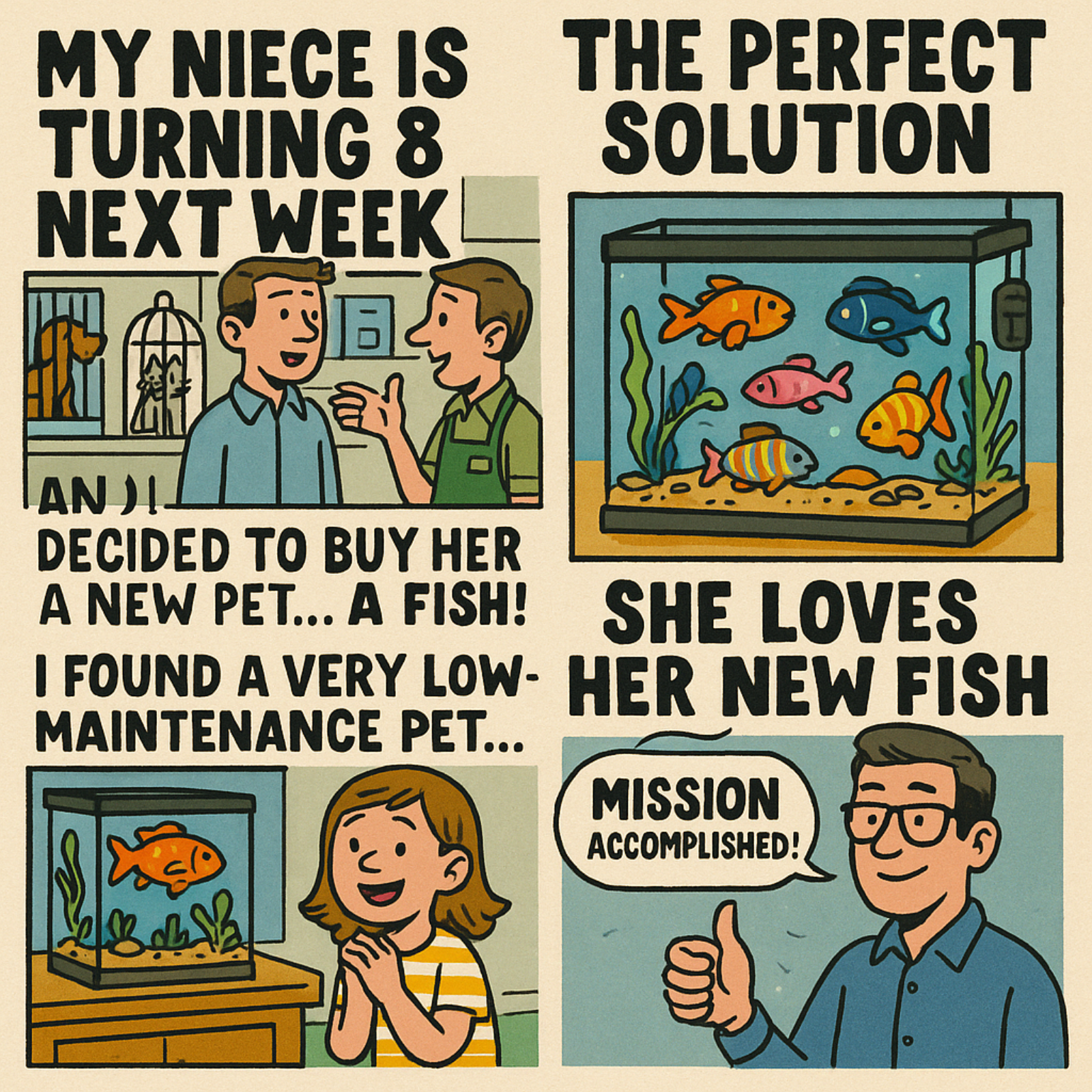 My niece is turning 8 next week and I decided to buy her a new pet. She had been asking her parents for a pet for a long time. But, they were worried about taking care of a pet. I told them I would go to the pet store to see if I could find a pet that wouldn't be too much of a bother. I walked into a big pet store and looked around. I saw cages with dogs and cats. There were also bird cages with birds of every color. I even saw some snakes! I saw a sales clerk and asked him for help. I told him that I was looking for a pet that was easy to take care of. He suggested a cat or a kitten. But, I told him that my niece was allergic to cats. Then, he suggested a puppy. I walked over to the rows of dog kennels and asked the clerk how often they needed to be walked. He said that usually, they needed to be taken out three to five times a day. That was much too much work, I told him. He then showed me some birds, including a parrot. Then, I asked him how often the cages had to be cleaned, and when he told me, I nixed that idea. Finally, he took me to the back of the store. I have the perfect pet for you, he said. I looked around and saw acquariums full of fish. There were about 20 different kinds. The clerk said that they were very easy to take care of. With the right equipment, you don't have to clean the tank regulary and all you have to do is feed the fish. That was it! The perfect solution. The next time I visited my niece, she told me she loved her fish. She had named them all. She even named one after me. It was called "Jeffish." Get it? Now, she's happy and so are her parents. Just before I left, my niece asked me: When can we go to Disneyland ? Ah, the work of an uncle is never done. Script by Dr. Lucy Tse