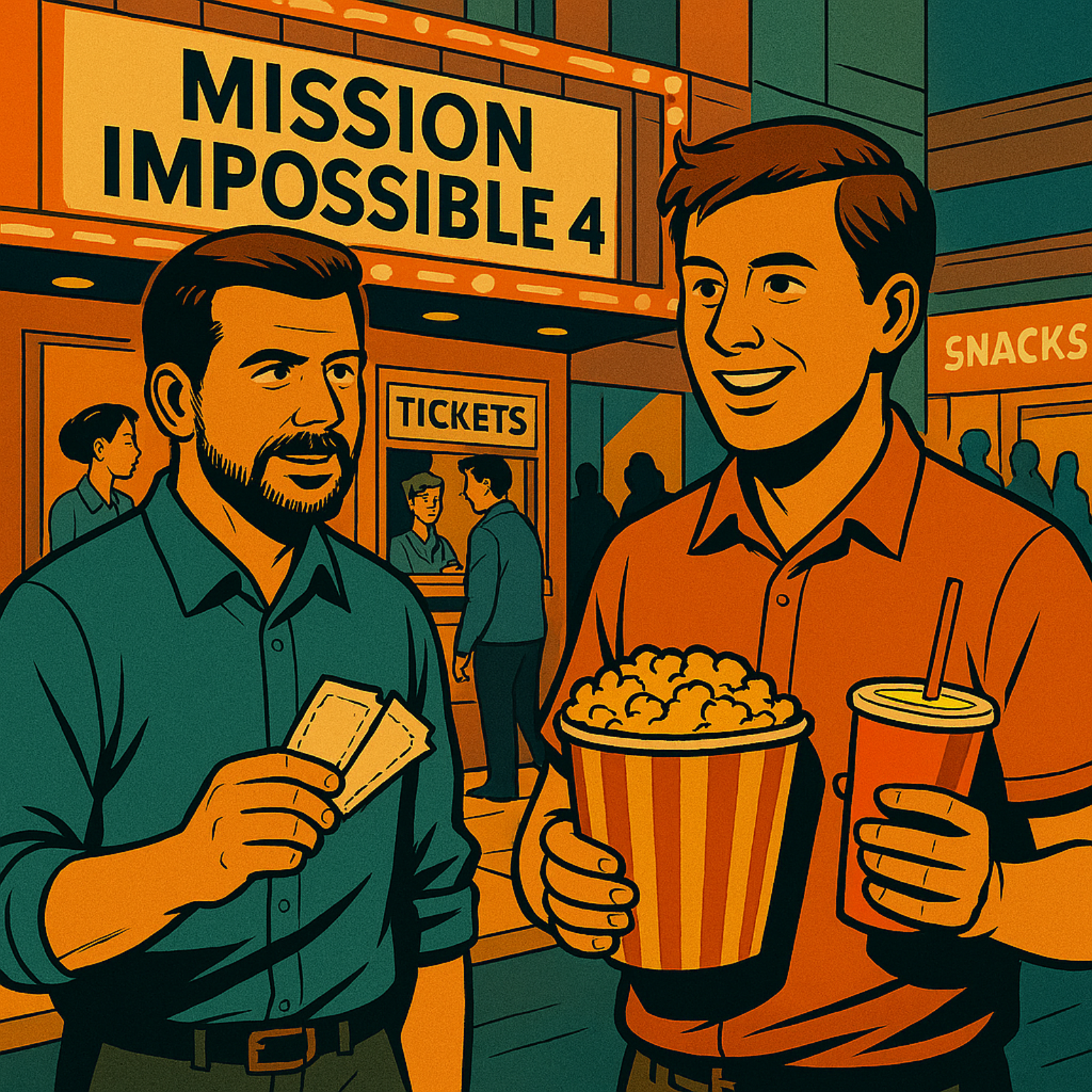 My friend Jim and I decided to see the latest blockbuster this weekend. I like a good action movie once in a while. We decided to meet at the movie theater after work. When I got the theater, I looked around and didn't see Jim. So, I thought I would get in line to buy tickets. There were two different lines so I asked a woman standing in the first one, "Is this the line for Mission Impossible 4?" and she said, "Yes, I'm afraid it is." I turned around and saw why she said that. It was really long and had about 20 people in it already. Oh, well. I went to the back of the line and waited. About 10 minutes later, I saw Jim coming up the escalator. He looked out of breath. He said, "Hey, sorry for being so late. I hit a lot of traffic on the way over." I told him, "Don't worry about it. As you can see, we have a long wait.‚" We finally got up to the head of the line. The clerk behind the ticket window said, "Can I help you?" and I said, "Two tickets for MI-4, please." We weren't children, students, or seniors, so there were no special discounts for us. The clerk handed me two tickets and we headed inside. There was a ticket taker just inside the door and he took our tickets, handing back to us our stubs. Coming straight from work , I was really hungry. Jim and I went to the concession stand and got a couple of Cokes, a tub of popcorn, a hotdog, and a box of candy. We were set. We went into the screening room and it was packed. Lucky for us, we found some seats together that weren't too close to the screen. We sat back and waited for the movie to start. While we watched 10 minutes of previews we wolfed down our food. By the time the movie started, I was feeling pretty good. I don't know which was better: The movie or the great junk food! Script by Dr. Lucy Tse
