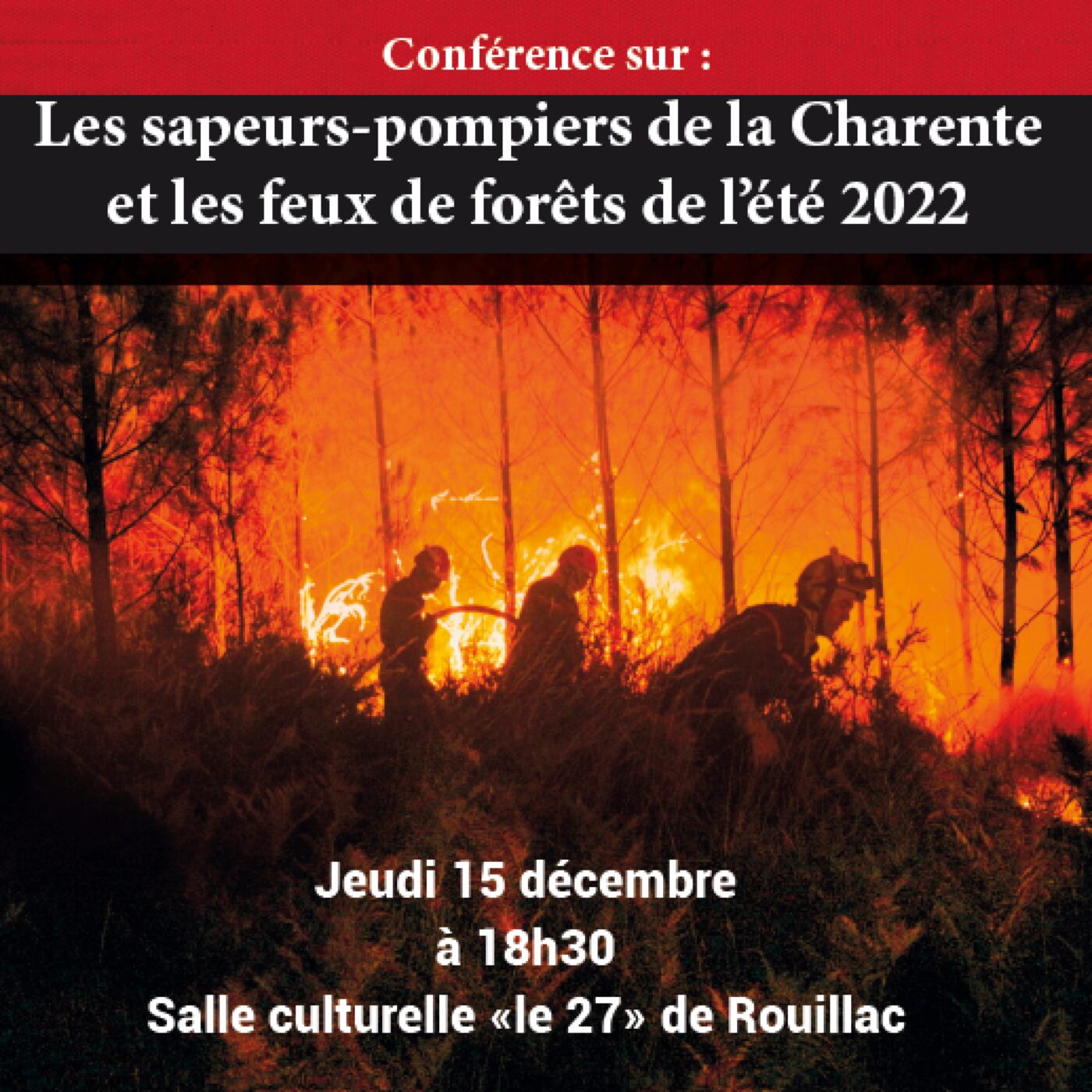 Trois Lions Club de l’Ouest-Charente invitent à une conférence sur les sapeurs-pompiers de la Charente et les feux de forêt de l’été 2022. Elle a lieu jeudi à la salle « le Vingt-sept » à Rouillac à 18h30.
