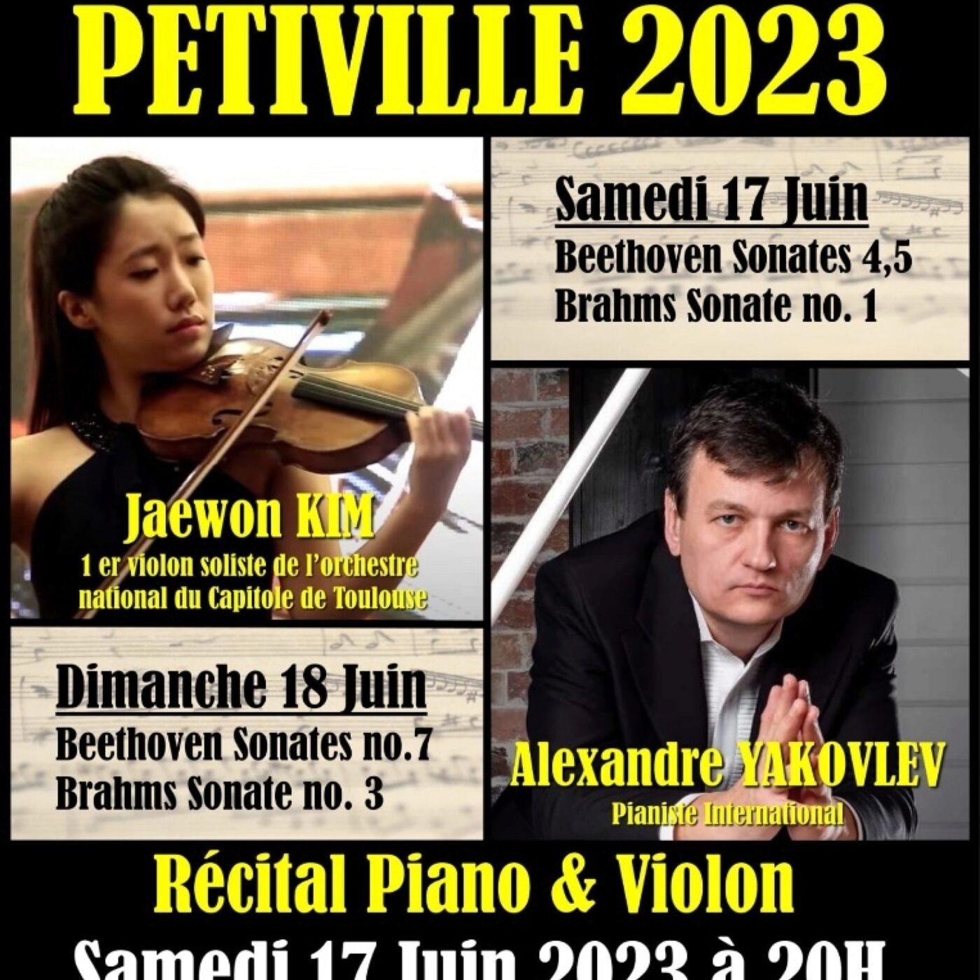 Concert les samedi 17 et dimanche 18 juin en l'église de Petiville avec Jaewon Kim, 1er violon soliste de l'orchestre national du Capitole de Toulouse et Alexandre Yakovlev, pianiste international pour un programme Beethoven et Brahms. Participation libre.