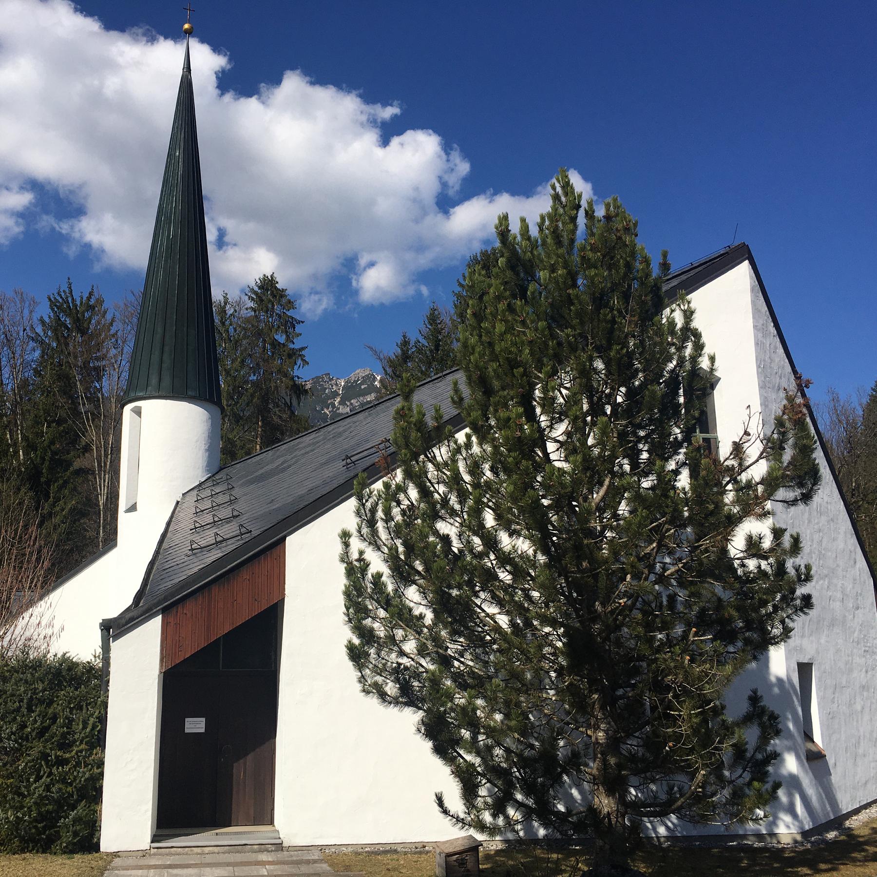 Die Grundsteinlegung der Erlöserkirche erfolgte 1960. Der Schöpfer und Kirchenarchitekt Olaf Gulbransson wollte eine behutsame Eingliederung des Gotteshauses in die bestehende Landschaft. Und wer am Vorplatz steht, genießt die Ansicht vor der Silhouette des Waxenstein-Massivs.