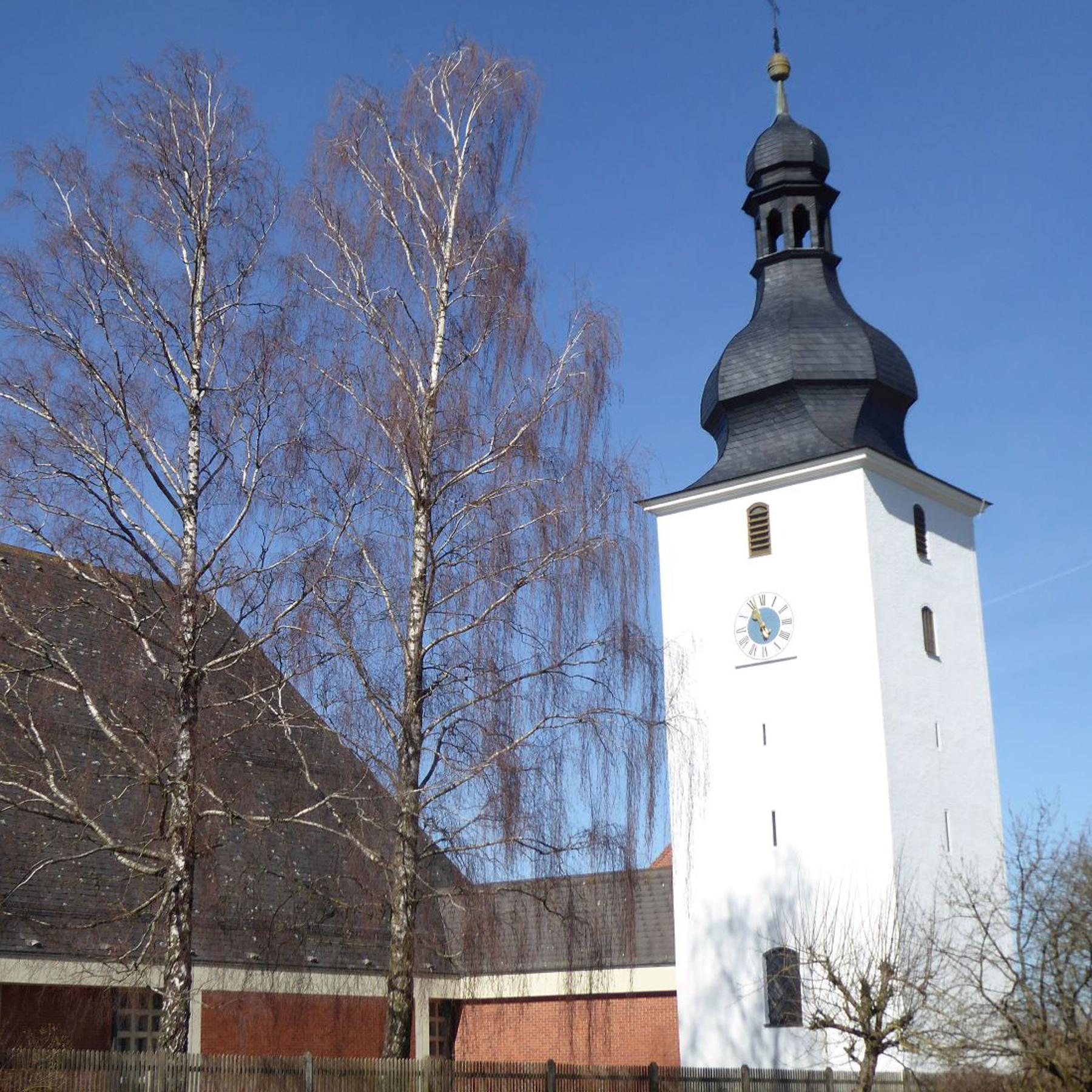 Der breite Turm der Pfarrkirche Mariä Himmelfahrt mit seiner Laternen-Zwiebel birgt in seinen wuchtigen Mauern einige kunstgeschichtliche Sehenswürdigkeiten, wie den Barockaltar und einige Grabtafeln der verschiedenen Schlossbesitzerfamilien aus der Vorgängerkirche.