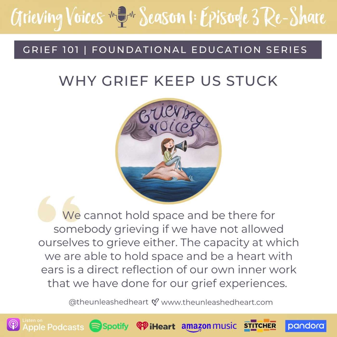 If you'd like to share your grieving voice on the show or want to share your thoughts about an episode, please send an email to victoria@theunleashedheart.com.