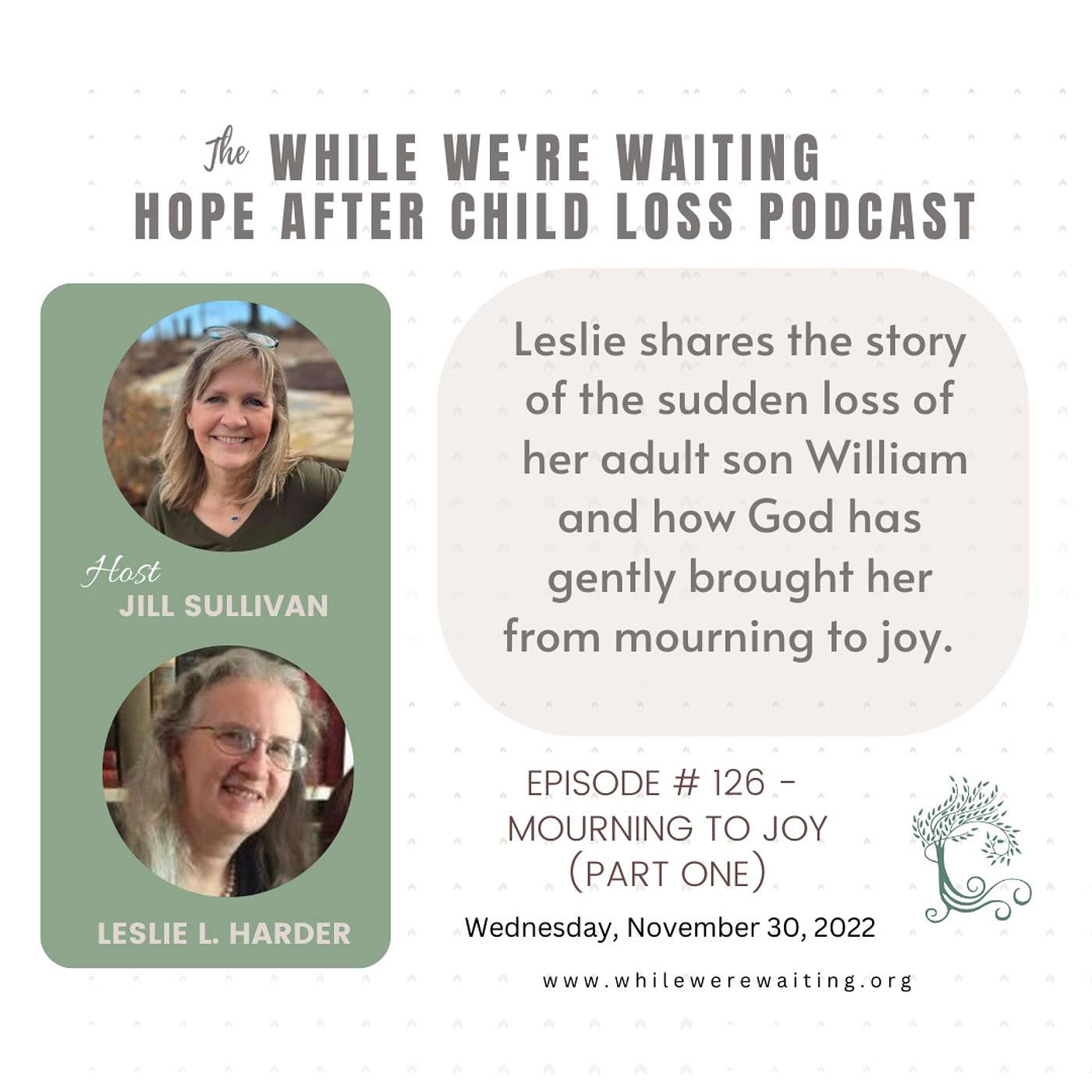I’m pleased today to introduce you to my friend Leslie Harder. Leslie joined me to record this episode on what would have been her son William’s 39th birthday. William went to Heaven suddenly and unexpectedly in August of 2016, just five days after the death of Leslie’s mother. In our conversation today, she shares about that experience and how God walked with her through those early days of grieving both her son and her mother. We also discuss her memoir “Joy in the Mourning – Viewing the Rainbow from the Vale of Tears,” in which she shares her story in a series of dated entries. I believe you’ll be encouraged by what she has to share today.