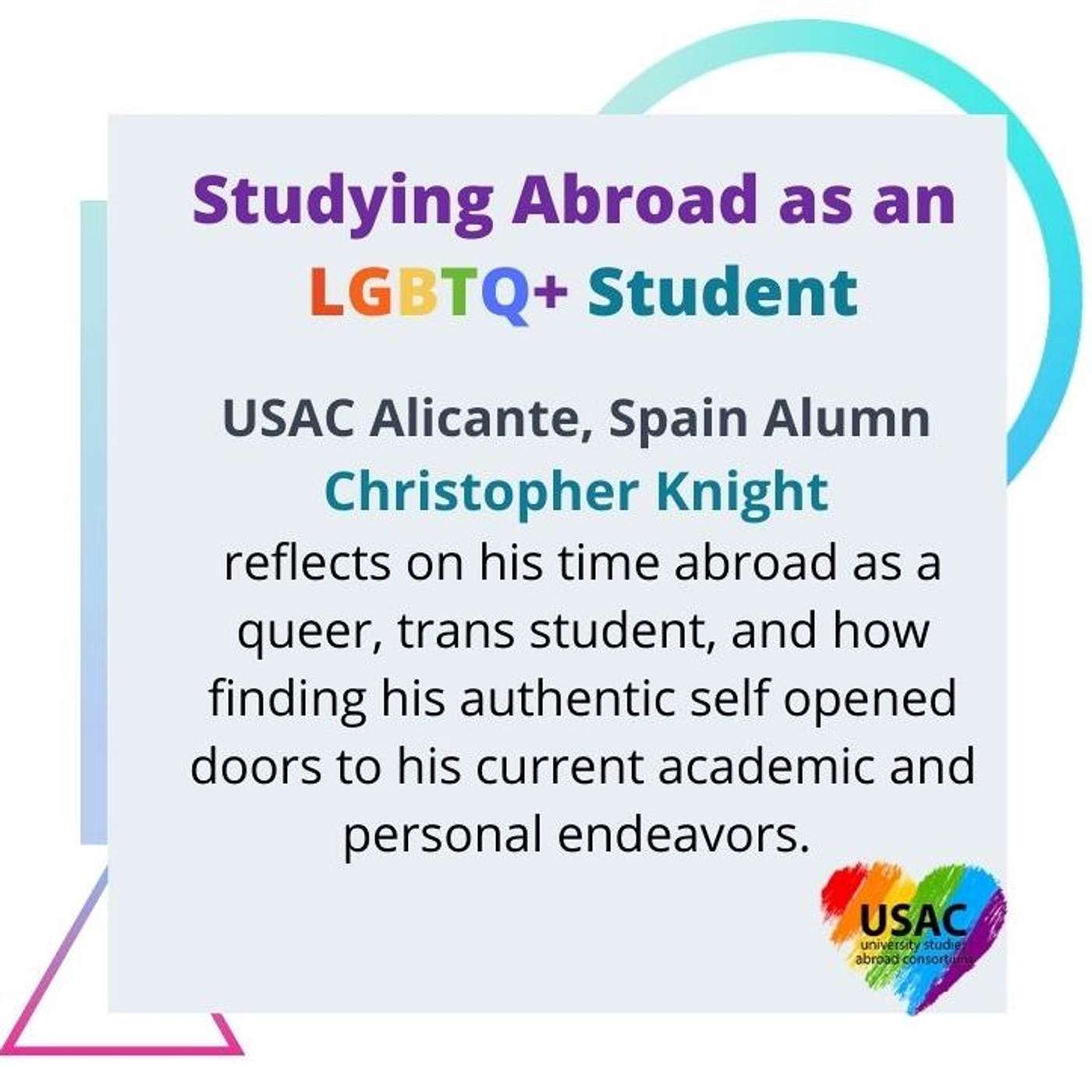 Join host Nicole as she chats with Christopher Knight, a USAC Alicante, Spain Alumn, who shares his experience studying abroad as a queer, trans student. Christopher discusses how identity can be viewed in global cultures, primarily Alicante, what his experience was being a queer, trans student abroad, and how language and authenticity played a part in opening doors to his current academic and personal endeavors.
