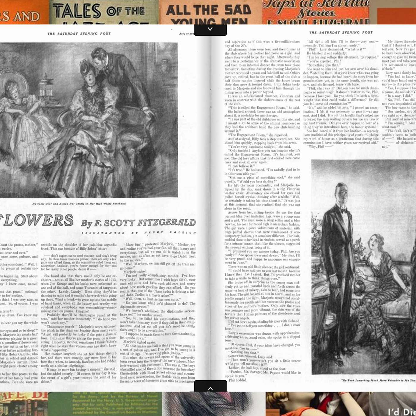 Published in the 21 July 1934 issue of the Saturday Evening Post, "No Flowers" is one of Fitzgerald's Great Depression stories that teaches a lesson about the frugality and humility many mainstream American outlets felt were necessary to survive the economic devastation of the decade. At first glance, the story can seem frivolous or even silly compared to the proletarian fiction pouring from the pens of more radical writers. A young woman, Marjorie, struggles to accept that she lives in "the tin age," as opposed to the golden age her mother, Amanda, enjoyed as a teenager. And what makes it a tin age? Her boyfriend, Billy Johns (no relation to Billy Joel, although we try our best to force one), not only can't afford a corsage for the prom they're scheduled to attend, but due to the austerity dictates of the time, aren't allowed. The story contrasts Marjorie's moral challenges at the dance to those of her mother and her grandmother, Lucy, both of whom have melancholy experiences at their own proms that challenge their ethical sensibilities. As its strangely renunciatory title suggests, "No Flowers" is an anti-romanticist story that explores the struggles of the post-jazz generation to find some purpose in maturation in a world that seems to have lost all sense of fun. It's not a great story by any means, but as we argue, even the most expendable of Fitzgerald stories have interesting ideas.