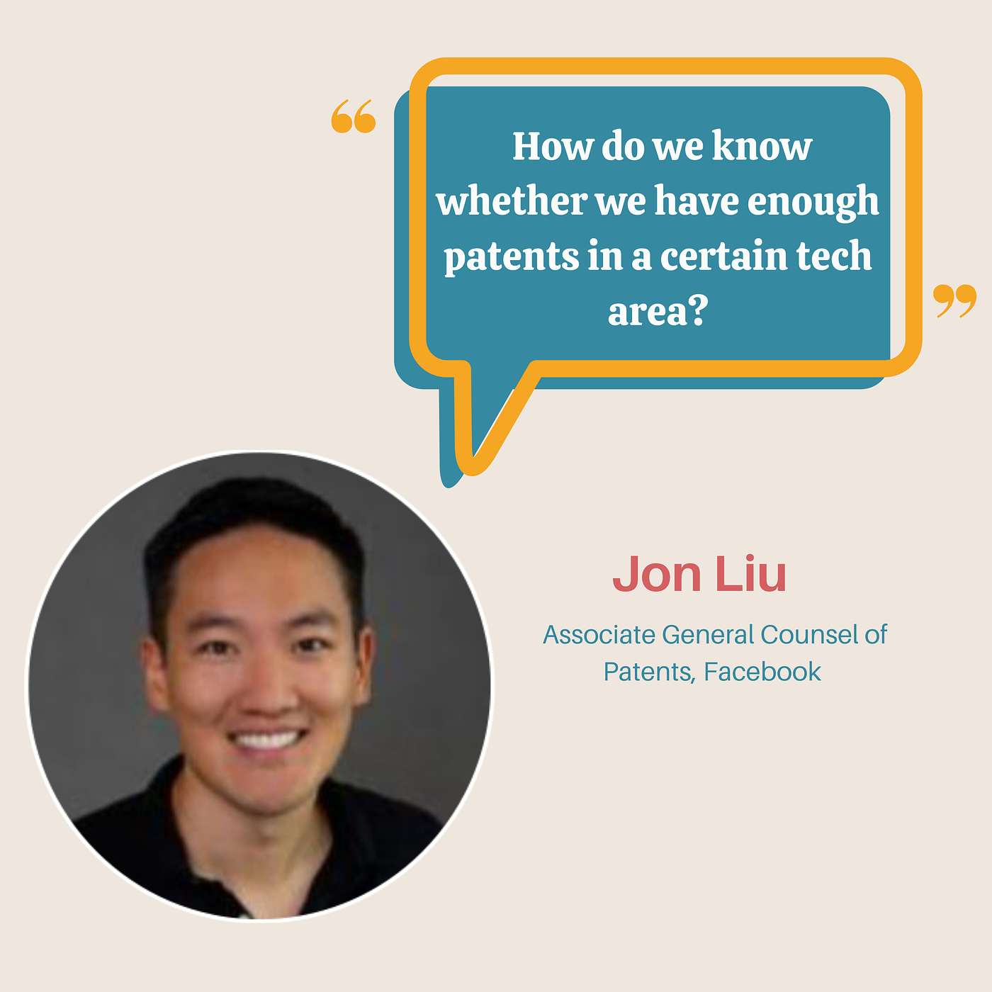 We are so excited to share a fascinating conversation with Jon Liu, Associate General Counsel of Patents at Facebook. In this episode, we hear about Jon’s career journey, especially how he focuses on optimizing resource allocation in #IP and making sure that the success metrics for his team align with business goals. We had a blast learning about Jon’s previous entrepreneurial journeys as well, and definitely see how he brings that spirit of entrepreneurship to everything he does at Facebook. We are still rooting for him to bring his college app back to life. We are so grateful to Jon for sharing his time, perspectives, and stories with us!