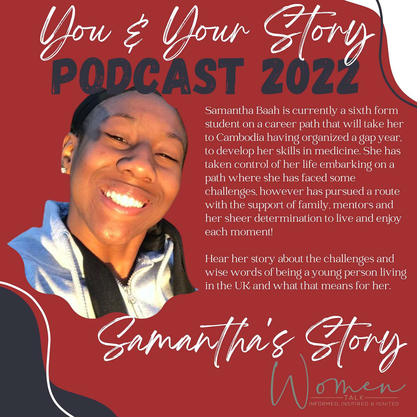 Samantha Baah is currently a sixth form student on a career path that will take her to Cambodia having organized a gap year in 2024, to develop her skills in medicine. She has taken control of her life embarking on a path where she has faced some challenges, however, has pursued a route with the support of family, mentors and sheer self determination to live and enjoy each moment!