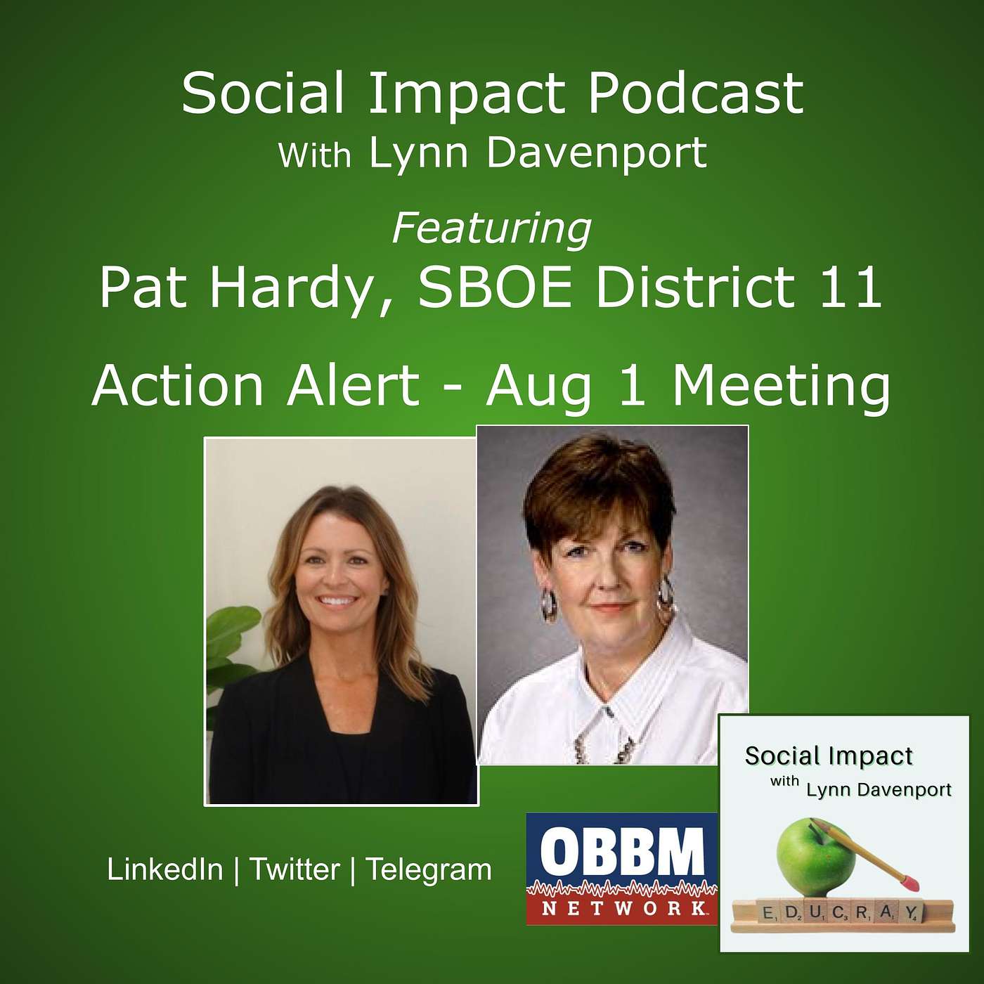 ALERT: TX SBOE will meet 8-1-2022 to Discuss Social Studies, New Standards. In this episode of Social Impact Podcast with Lynn Davenport, Lynn talks with Pat Hardy, Texas State Board of Education for District 11, to disuss the proposed new standards for K-12 social studiesk being decided August 1, 2022. Before this SBOE meeting on August 1st, you can register for in person testimony beginning July 28, at 8a.m. and closing July 29, at 5p.m.