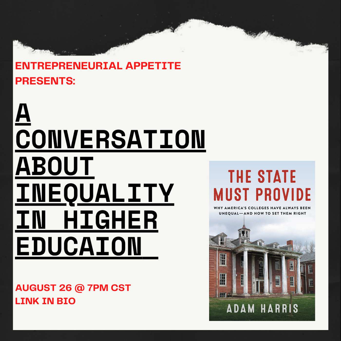 In this edition of Entrepreneurial Appetite's Black Book Discussions, we feature conversations with Adam Harris, staff writer for The Atlantic Magazine and author of The State Must Provide: Why America's Colleges Have Always Been Unequal--and How to Set Them Right.