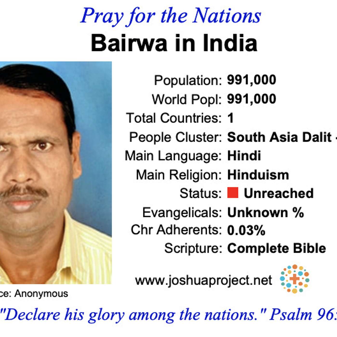 Prislovie 16:9 Človek v srdci zvažuje svoju cestu, no Hospodin jeho kroky usmerňuje.http://bit.ly/nzes-dneshttps://slovenskamisijnasiet.sk/Viac o etnickej skupine Bairwa nájdete na:https://joshuaproject.net/people_groups/16298/IN
