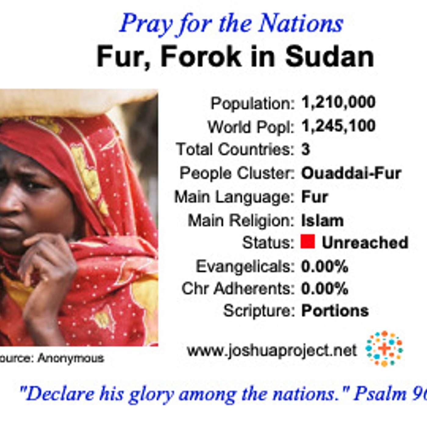 Lukáš 11:9 A ja vám hovorím: Proste a dostanete! Hľadajte a nájdete! Klopte a otvoria vám. http://bit.ly/nzes-dneshttps://slovenskamisijnasiet.sk/Viac o etnickej skupine Fur nájdete na:https://joshuaproject.net/people_groups/11779/SU