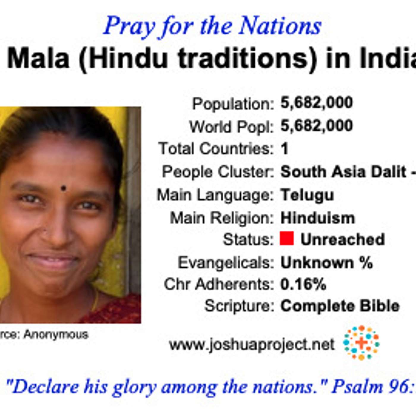 2 Korintanom 5:7 Žijeme totiž z viery, nie z toho, čo vidímehttp://bit.ly/nzes-dneshttps://slovenskamisijnasiet.sk/Viac o etnickej skupine Mala nájdete na:https://joshuaproject.net/people_groups/17425/IN