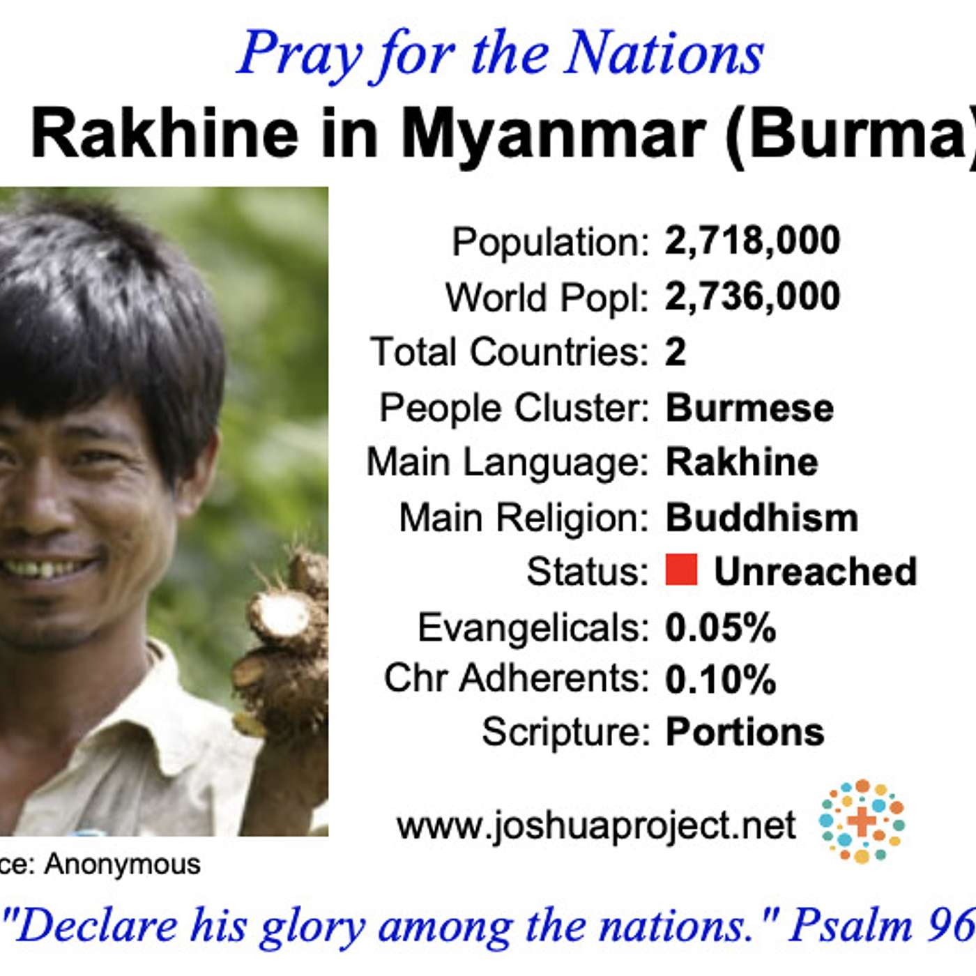 2. Timoteovi 2:13 ak sme neverní, on zostáva verný, veď nemôže zaprieť seba saméhoSMS Kalendár 2022 - bit.ly/SMSKalendár2022http://bit.ly/nzes-dnesViac o etnickej skupine Rakhine nájdete na:https://joshuaproject.net/people_groups/13207/BM