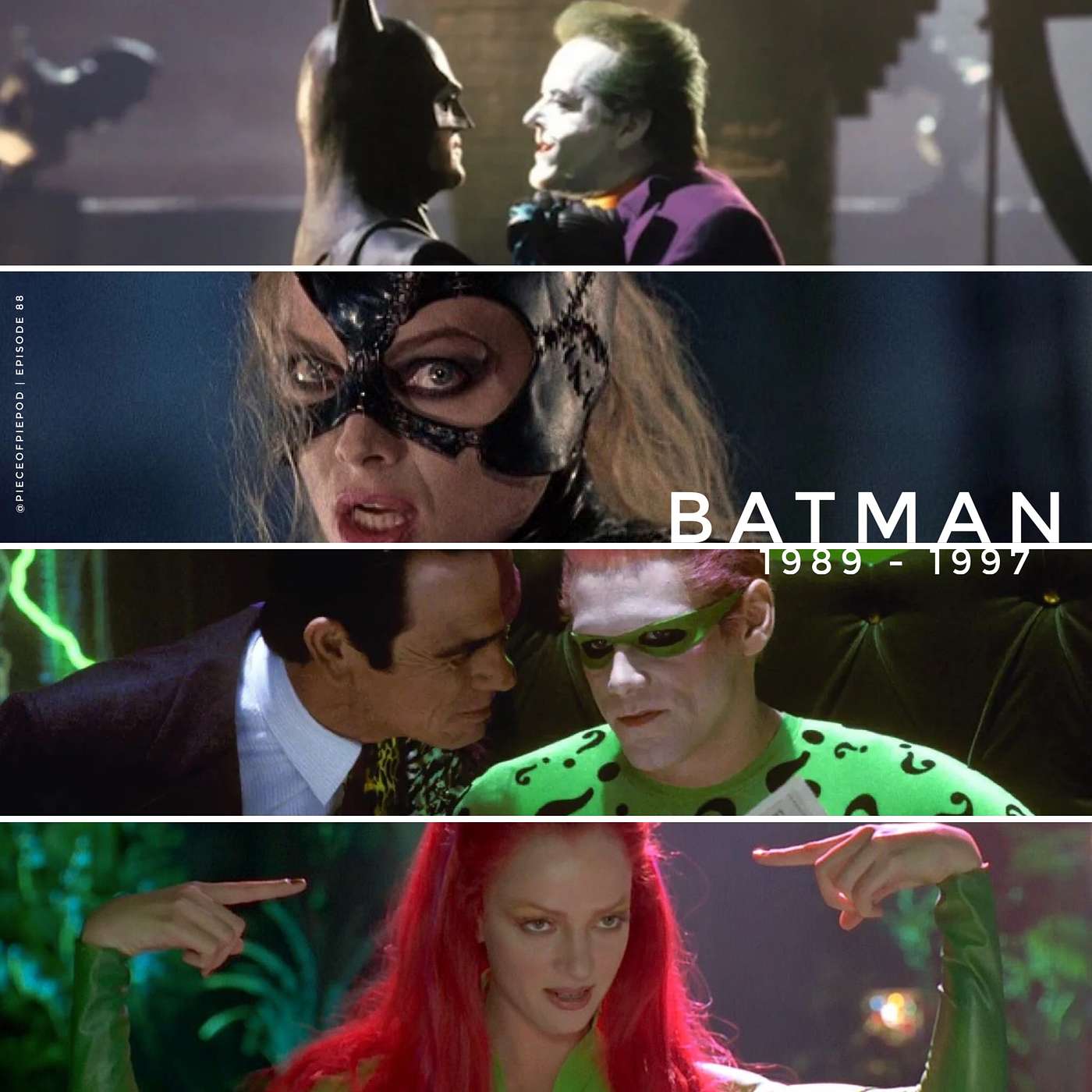 To commemorate the release of an all-new Batman movie, we at Piece of Pie decided to take a look back! This time we’re discussing the gayest superhero films of all time; Batman Forever and Batman & Robin! But we couldn’t discuss those without setting our sights on the two Bat-flicks that preceded them, Tim Burton’s Batman, and Batman Returns.