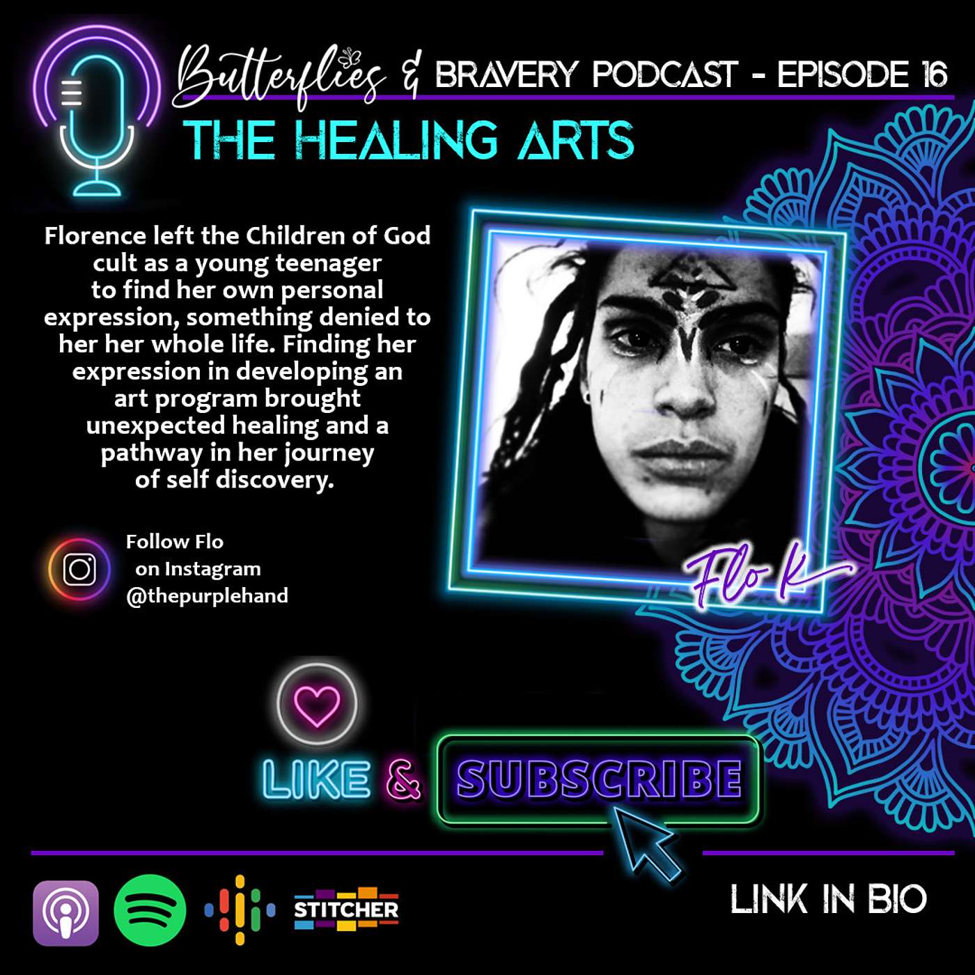 Florence was one of the later group of children born into the Children of God cult, and the youngest sibling who lost her oldest sister in the same horrific accident we learned about in an earlier podcast episode, The Accident that Changed Everything. Born into a family of artists and entertainers who used their talents to make animal balloons, Florence left the cult as a young teenager to find her own personal expression, something denied to her her whole life. Creating a life from nothing brought challenges and pain, and she struggled to find where she fit in this world. Developing an art program called the House of Kenzo brought unexpected healing and a pathway in her journey of self discovery.