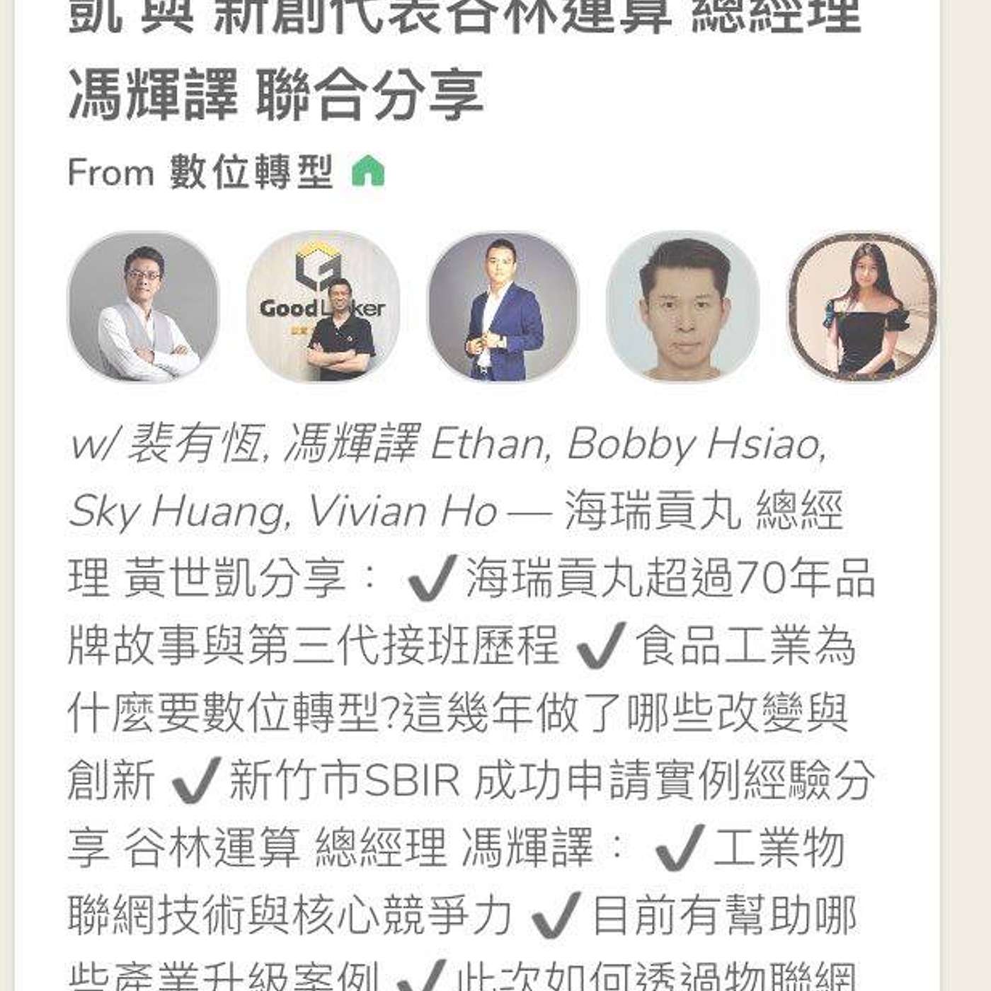 食品工業物連網篇 產業代表 海瑞貢丸 總經理 黃世凱 與 新創代表谷林運算 總經理 馮輝譯 聯合分享 本集節目重點~