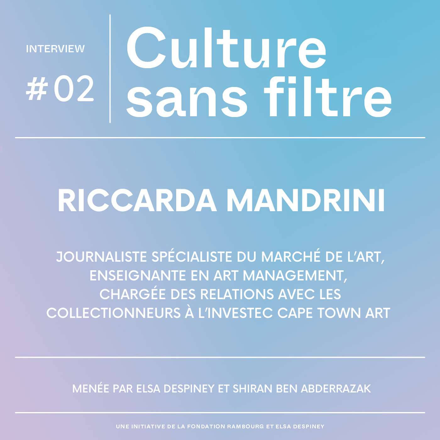 Pour ce deuxième entretien, Culture sans filtre vous propose d’aller en Afrique du Sud à travers un échange avec Riccarda Mandrini, enseignante en art management, journaliste spécialiste du marché de l’art, qui nous parle d’Investec Cape Town Art Fair où elle est en charge des relations avec les collectionneurs. Dans cet entretien il est question des enjeux des foires d’art contemporain sur le continent, de l’importance d’éduquer les publics, et de la nécessité d’ouvrir les foires à tous les pays pour un véritable brassage artistique.