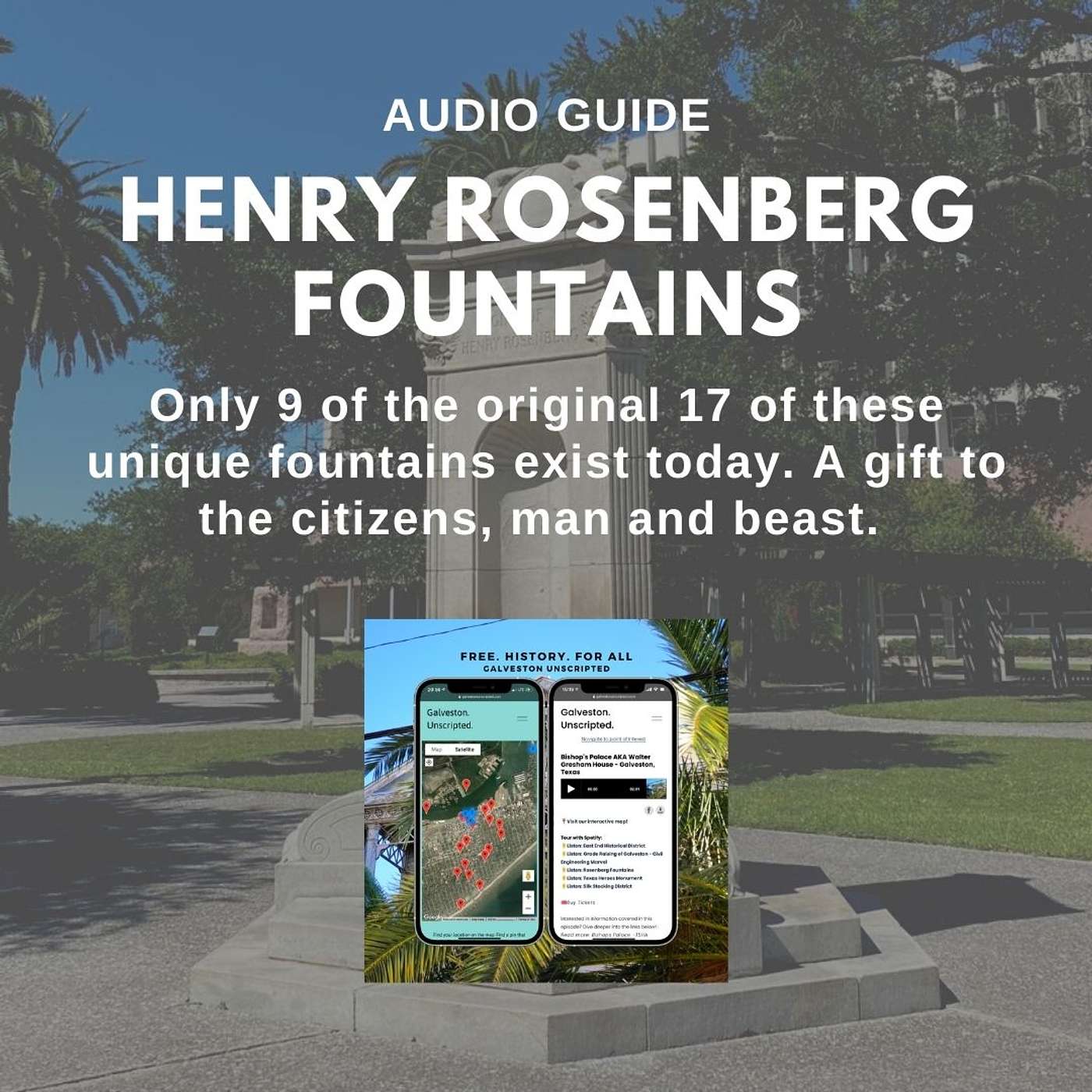 Key Words: Galveston, Texas, History, Island, Beach, cruise, cruise ship, vacation, Henry Rosenberg, Fountains, East End Historic District, Strand, Seawall, Bolivar, Houston, Audio Tour, Audio Guide, Free Tour, Free in Galveston,