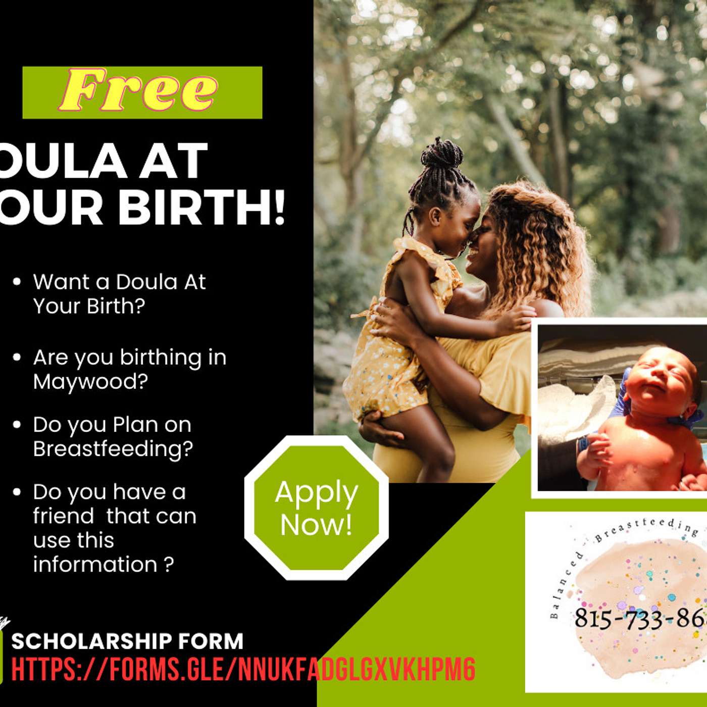 Priority will be given to families in the Maywood and surrounding areas. Robin Ross of Blissful Births and Babies will provided: