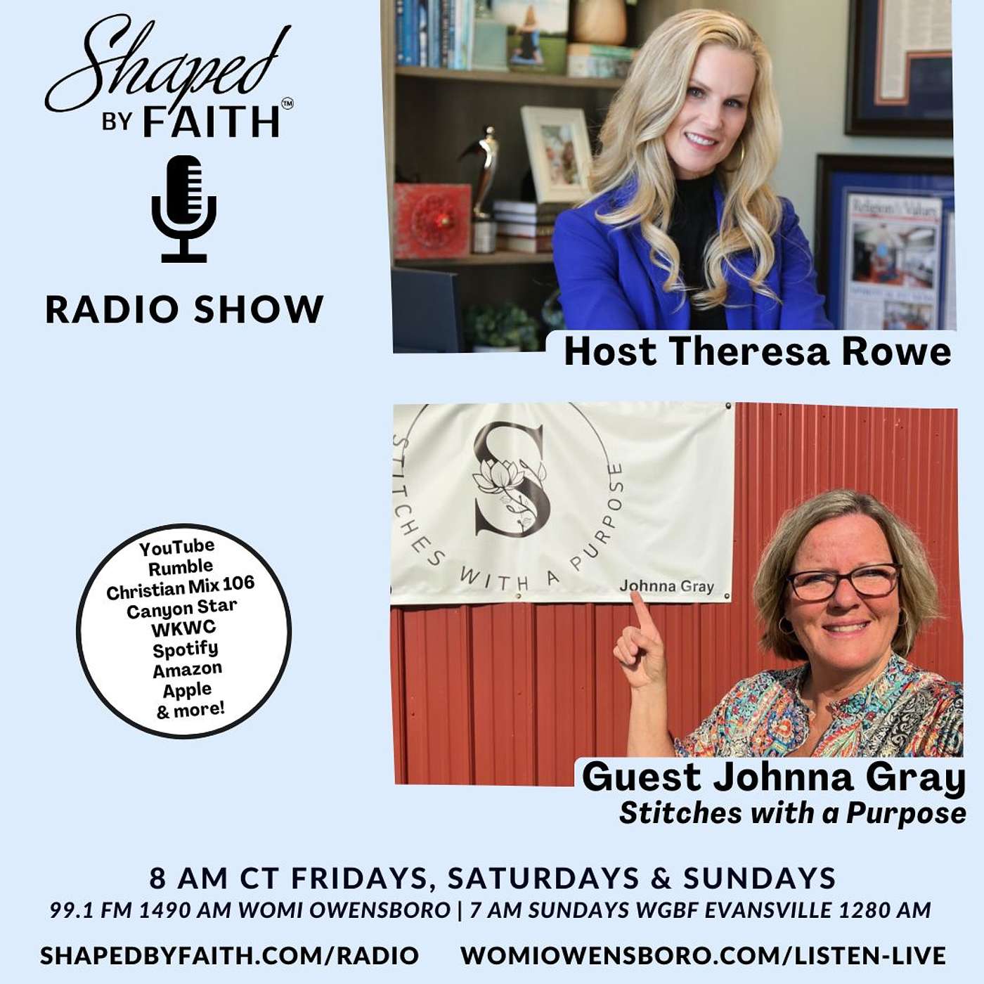 This week on the Shaped by Faith Radio Show, Host Theresa Rowe welcomes Johnna Gray, founder of Stitches with a Purpose — a ministry that turns grief into grace, one stitch at a time.