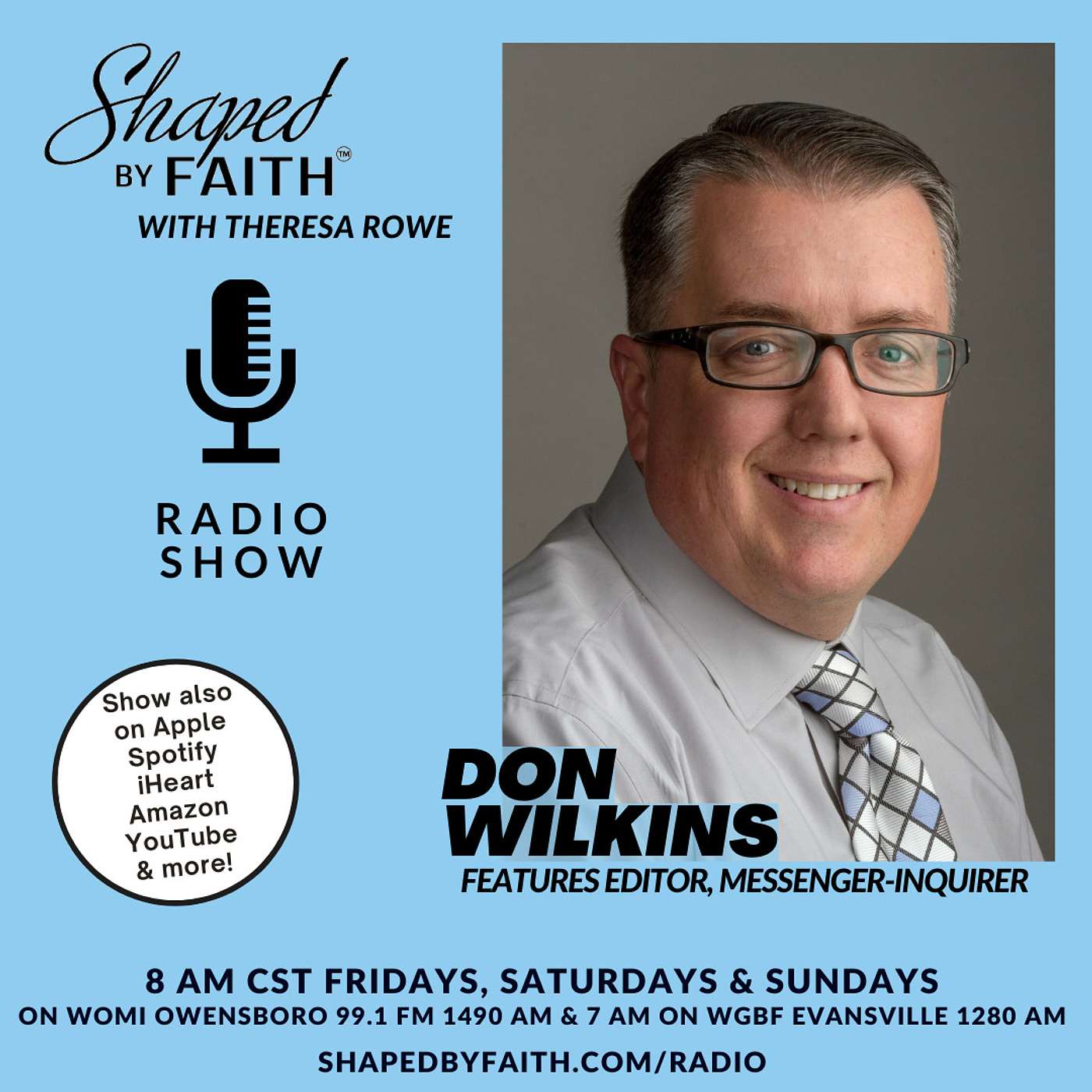 Listen Live to Shaped by Faith with Theresa Rowe on Fridays, Saturdays and Sundays at 8 AM CST on 99.1 FM WOMI Owensboro 1490 AM. Also airs at 7 AM Sundays on WGBF Evansville 1280 AM.