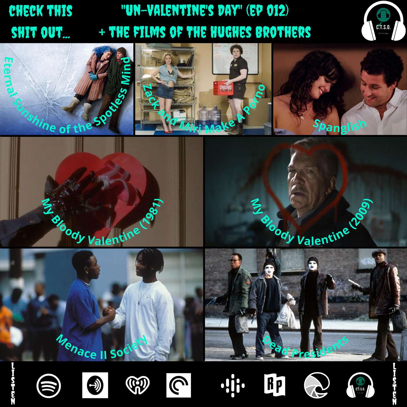 Films covered in Episode 12: Eternal Sunshine of the Spotless Mind (2004), Zack and Miri Make A Porno (2008), Spanglish (2004), My Bloody Valentine (1981), My Bloody Valentine (2009), Menace II Society (1993), and Dead Presidents (1995).