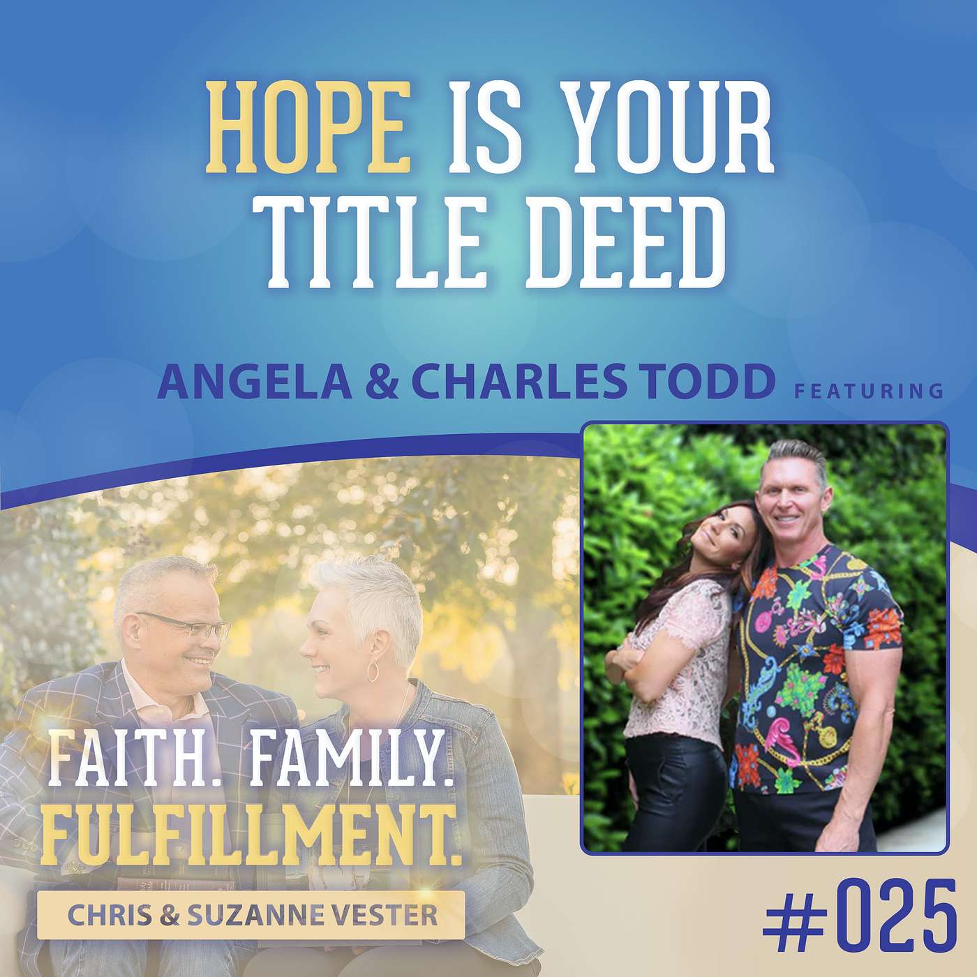 – Faith. Family. Fulfillment. with Chris and Suzanne Vester Episode 025 Angela and Charles Todd.From bankruptcy to divorce remarrying each other and prospering God's way, best-selling authors Angela and Charles Todd figured out (a thing or two…) how to work the word of God to increase and thrive in their finances, marriage, relationships, and health. In 2006, they founded Todd WorldWide Ministries, a 501c3 that helps others succeed spiritually, physically, and financially, and co-host "The Abundant Life" talk show sharing their journey to success (Local Now channel 509 & YouTube). The Todds firmly believe it's not the responsibility of children to take care of their parents but that children get set up early in life to prosper so that they can be a blessing to their children's children for generations to follow. Listen to this uplifting Faith. Family. Fulfillment. episode with Angela and Charles Todd about WorldWide Ministries!Here is what to expect on this week’s show:- The various projects Angela and Todd work on, including their podcast, book series, and ministry.- Their early struggle with bankruptcy and divorce and how they both overcame this and re-united with each other.- Finding God’s signs through reading and knowing when they will come to you for guidance. Connect with Angela and CharlesGuest Links Website- www.toddworldwide.org www.moneymikeandthegang.comInstagram- @todd_worldwideLearn more about your ad choices. Visit megaphone.fm/adchoices
