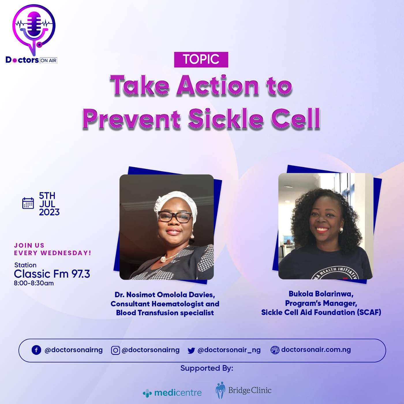 Dr. Pamela and guests: Dr. Nosimot Omolola Davies, Consultant Haematologist and Blood Transfusion expert, and Bukola Bolarinwa, Program's Manager at Sickle Cell Aid Foundation (SCAF) discussed about taking action to combat sickle cell.