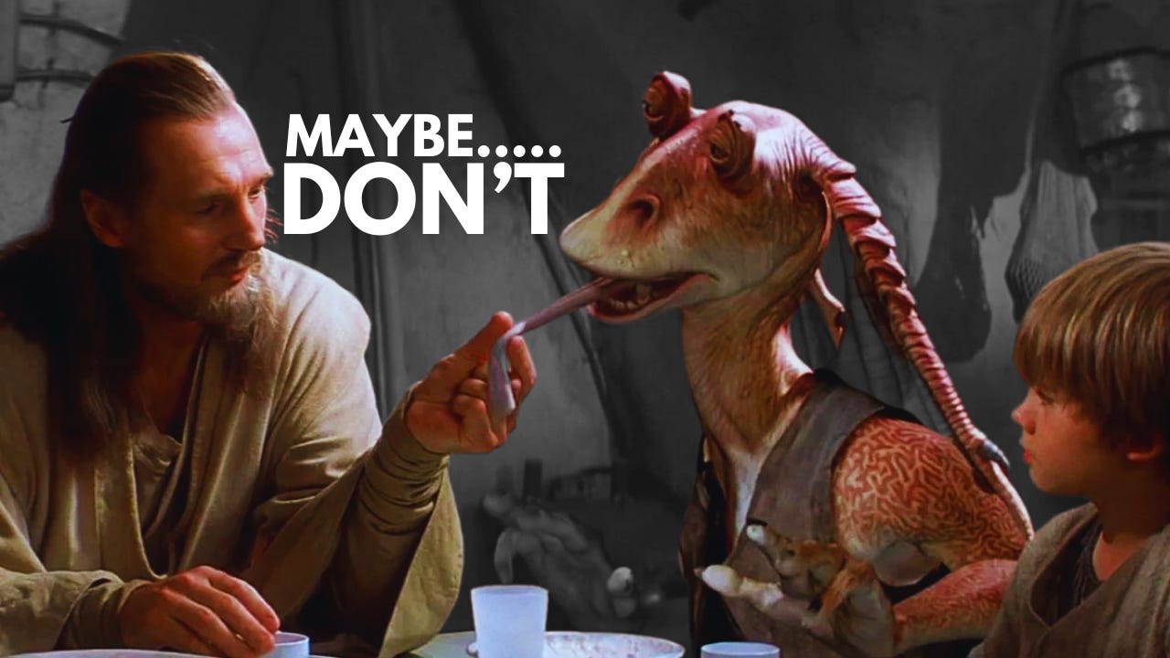 Indeed. It’s fitting then that later in the movie, Jar Jar gets his tongue grabbed by Qui-Gon Jinn at the dinner table.