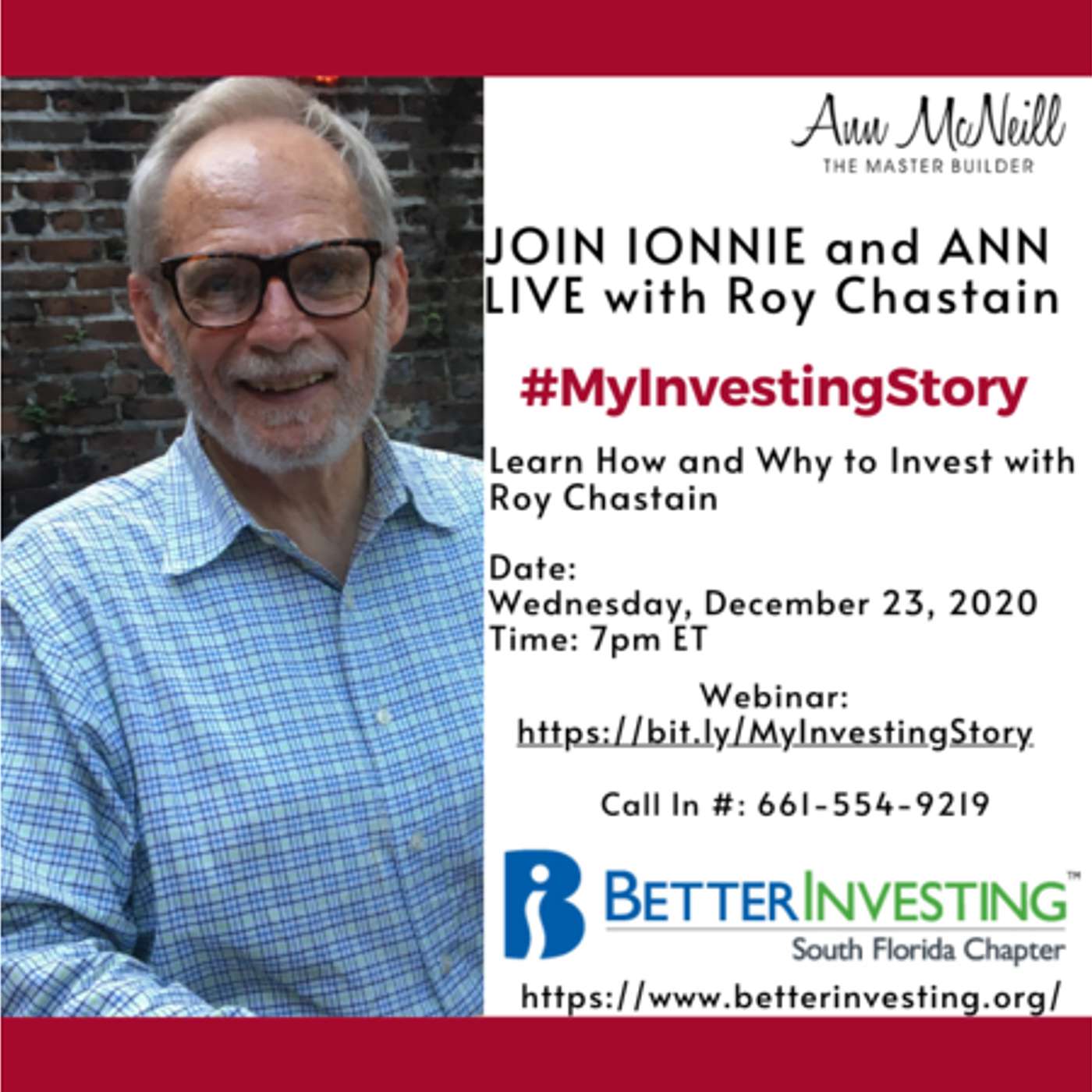 #MyInvestingStory is created to share the stories of individual investors.Ann and Ionnie McNeill, speaks with Roy Chastain about his investing story.To join the conversation:Register for the webinar: https://bit.ly/MyInvestingStoryListen to the podcast: http://tobtr.com/11865754Or call in: 661-554-9219Roy Chastain has had two main careers; a Communications Technician in the U.S. Navy and at The Pacific Telephone and Telegraph Company, and as an attorney with the State of California. He has been married to Vicky for 40 years and they have one daughter.He retired from the state in November 2007. Roy was raised by his depression-era dad who believed “Stocks aren’t worth the paper they’re written on.” So, he learned that a savings account was important. That changed in 1992 when 12 friends from church formed the Greenhaven Investment Club.Besides learning to do SSGs by hand, and learning from instructors with the Sacramento Area Chapter, he learned the BetterInvesting (NAIC at that time) philosophy from Ellis Traub. The most recent gurus have been Carol Theine and Doug Gerlach, along with many others. He eventually joined the Chapter Board of Directors and in 2014 joined the ICLUBcentral Board of Directors and the BetterInvesting Financial and Audit Committee.He has also performed Club Visits and made presentations to city libraries and Presbyterian Women on Financial Literacy for Women and Families, as well as being a presenter on some webinars, and now work the back room for StockUp and TickerTalk programs.