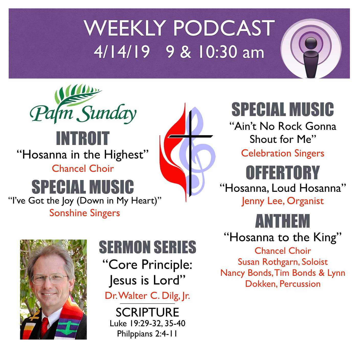 [00:00] Introit - "Hosanna in the Highest" (Hal H. Hopson) - Chancel Choir[00:31] Special Music: "I've Got the Joy (Down in My Heart)" - (G.W. Cooke) - Sonshine Singers[02:33] Special Music: "Ain't No Rock Gonna Shout for Me" (Lloyd Larson) - Celebration Singers[05:15] Scripture: Luke 19:29-32, 35-40; Philippians 2:4-11[07:52] Offertory: "Hosanna, Loud Hosanna" (J. Wayne Kerr) - Jenny Lee, Organist[10:09] Anthem: "Hosanna to the King" (Craig Courtney)- Chancel Choir, Susan Rothgarn, soloist Nancy Bonds, Tim Bonds & Lynn Dokken, percussion[12:48] Sermon: "Core Principle: Jesus is Lord" - Dr. Walter C. Dilg, Jr.