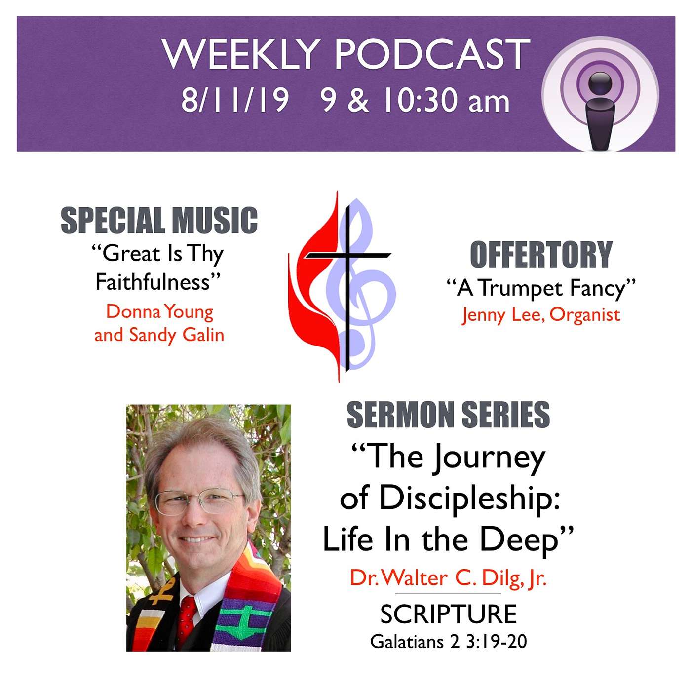 [00:00] Special Music: "Great Is Thy Faithfulness" (arr. Lloyd Larson)[03:54] Scripture: Galatians 2:19-20[04:39] Offertory: "A Trumpet Fancy" (L. Nelson) - Jenny Lee, Organist[05:34] Sermon Series: "The Journey of Discipleship: Life In the Deep" - Dr. Walter C. Dilg, Jr.