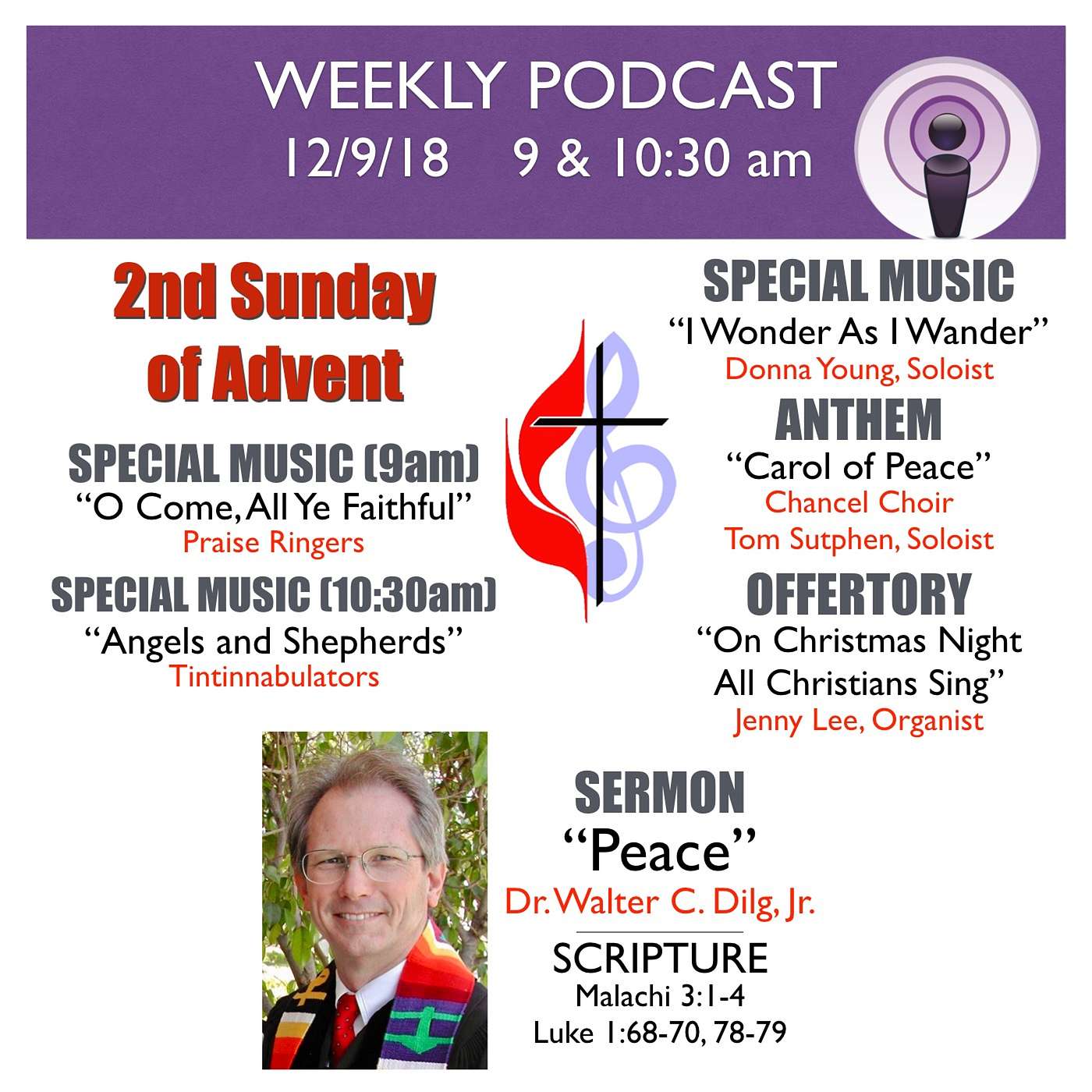 [00:00] Special Music: "O Come All Ye Faithful" (arr. Kevin McChesney) - Praise Ringers[02:36] Special Music: "Angels and Shepherds" (arr. Lynn Hollander) - Tintinnabulators[04:45] Special Music: "I Wonder As I Wander" (John Jacob Niles) - Donna Young, soloist[09:02] Scripture: Malachi 3:1-4; Luke 1:68-70, 78-79[10:49] Anthem: "Carol of Peace" (Ruth Anderson) - Chancel Choir, Tom Sutphen, Soloist[12:54] Offertory: "On Christmas Night All Christians Sing" (A. Page) - Jenny Lee, Organist[14:39] Sermon: "Peace" - Dr. Walter C. Dilg, Jr.