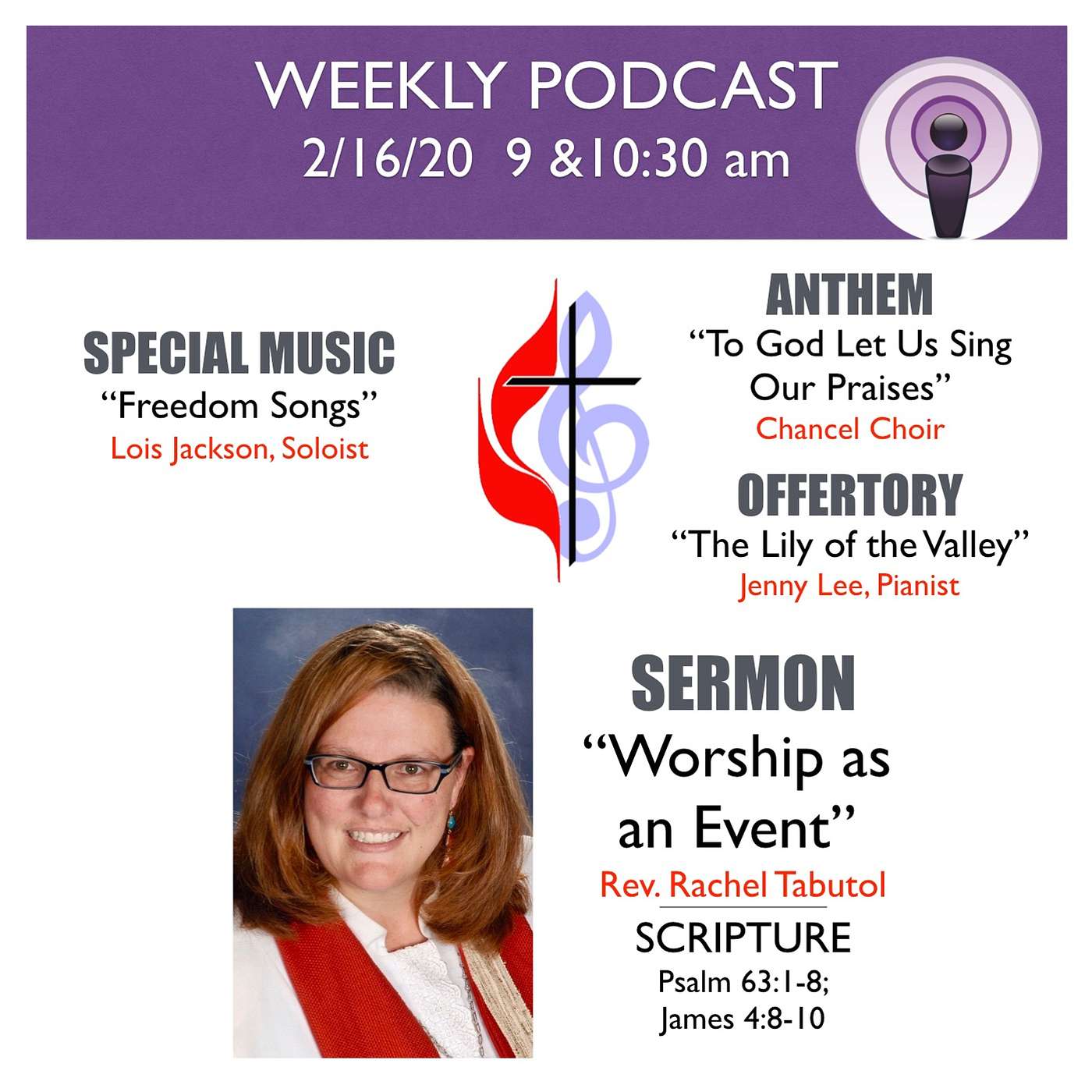 [00:00] Special Music: "Freedom Songs" - Lois Jackson[02:43] Scripture: Psalm 63:1-8; James 4:8-10[04:17] Offertory: "The Lily of the Valley" (arr. K.D. Varner) - Jenny Lee, organist[07:00] Anthem: "To God Let Us Sing Our Praises" (arr. J. Bertalot) - Chancel Choir[09:30] Sermon: "Worship as an Event" - Rev. Rachel Tabutol