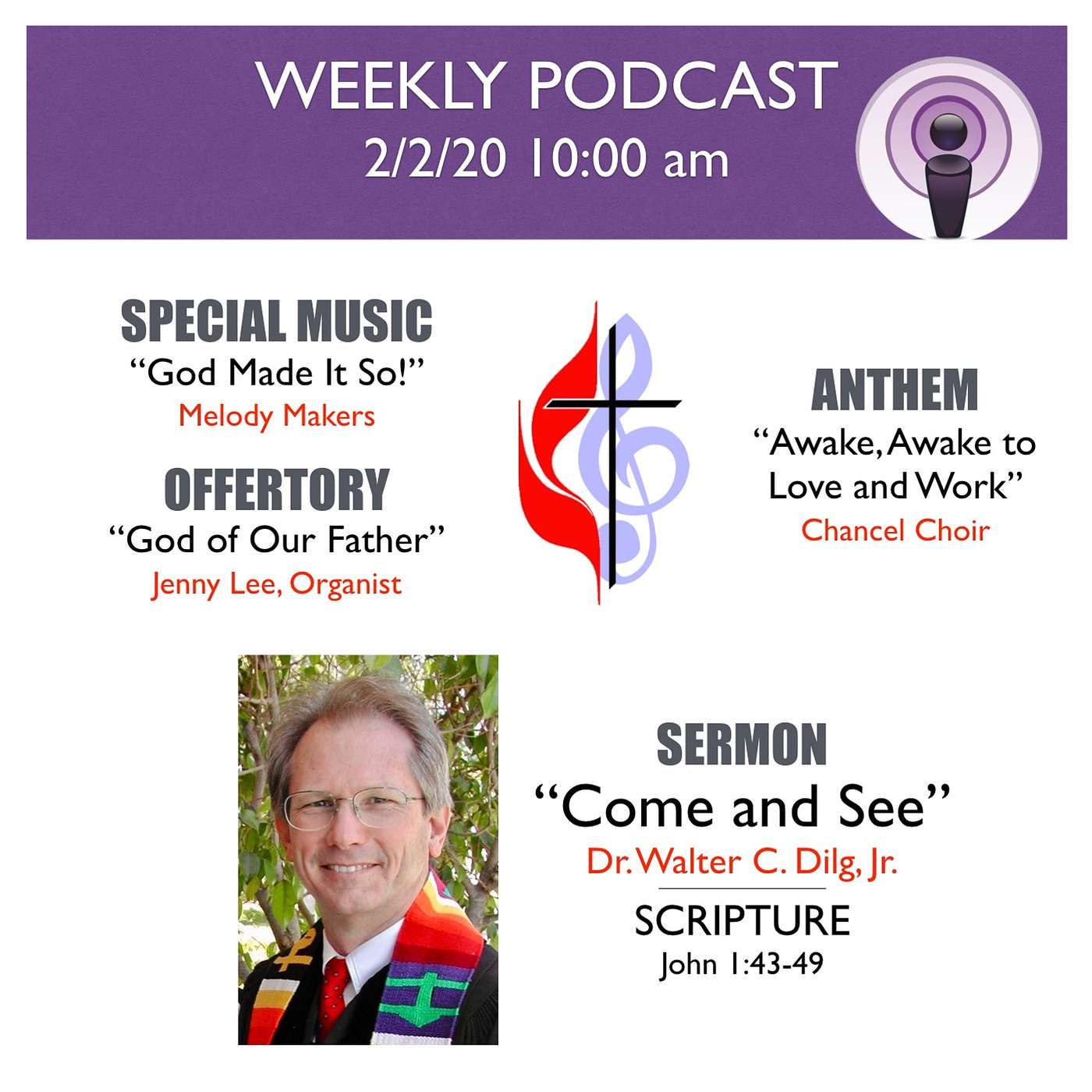 [00:00] Special Music: "God Made It So!" (Terry D. Taylor) - Melody Makers[02:39] Scripture: John 1:43-49[03:59] Offertory: "God of Our Father (M. McDonald)[06:00] Anthem: "Awake, Awake to Love and Work" (Eric. H. Thiman) - Chancel Choir[08:12] Sermon: "Come and See" - Dr. Walter C. Dilg, Jr.