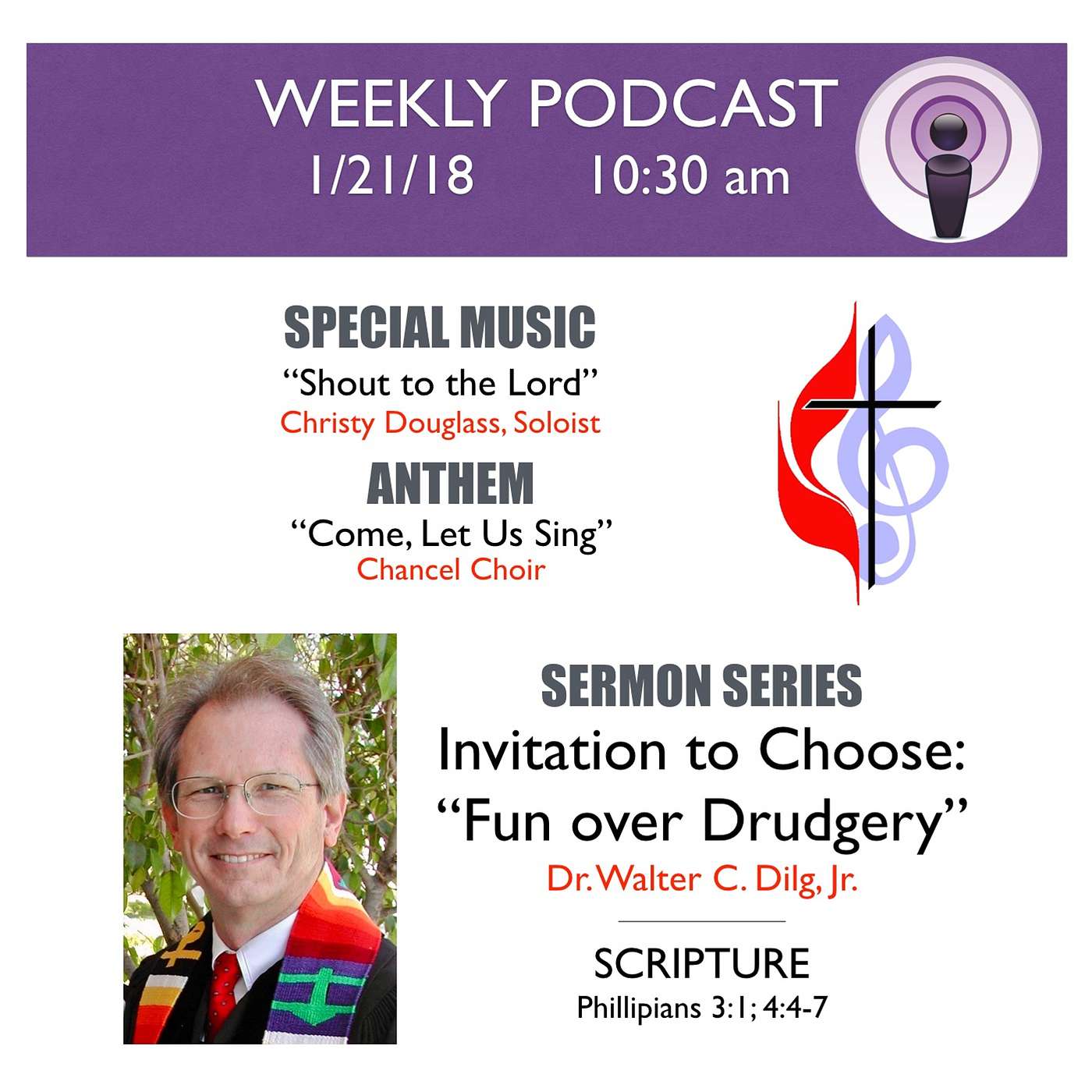 (0:00) Special Music: "Shout to the Lord" - Christy Douglass, Soloist(03:30) Scripture: Phillippians 3:1; 4:4-7(04:26) Anthem: "Come, Let Us Sing" - Chancel Choir(08:47) Sermon Series: "Invitation to Choose: Fun over Drudgery"Dr. Walter C. Dilg, Jr.
