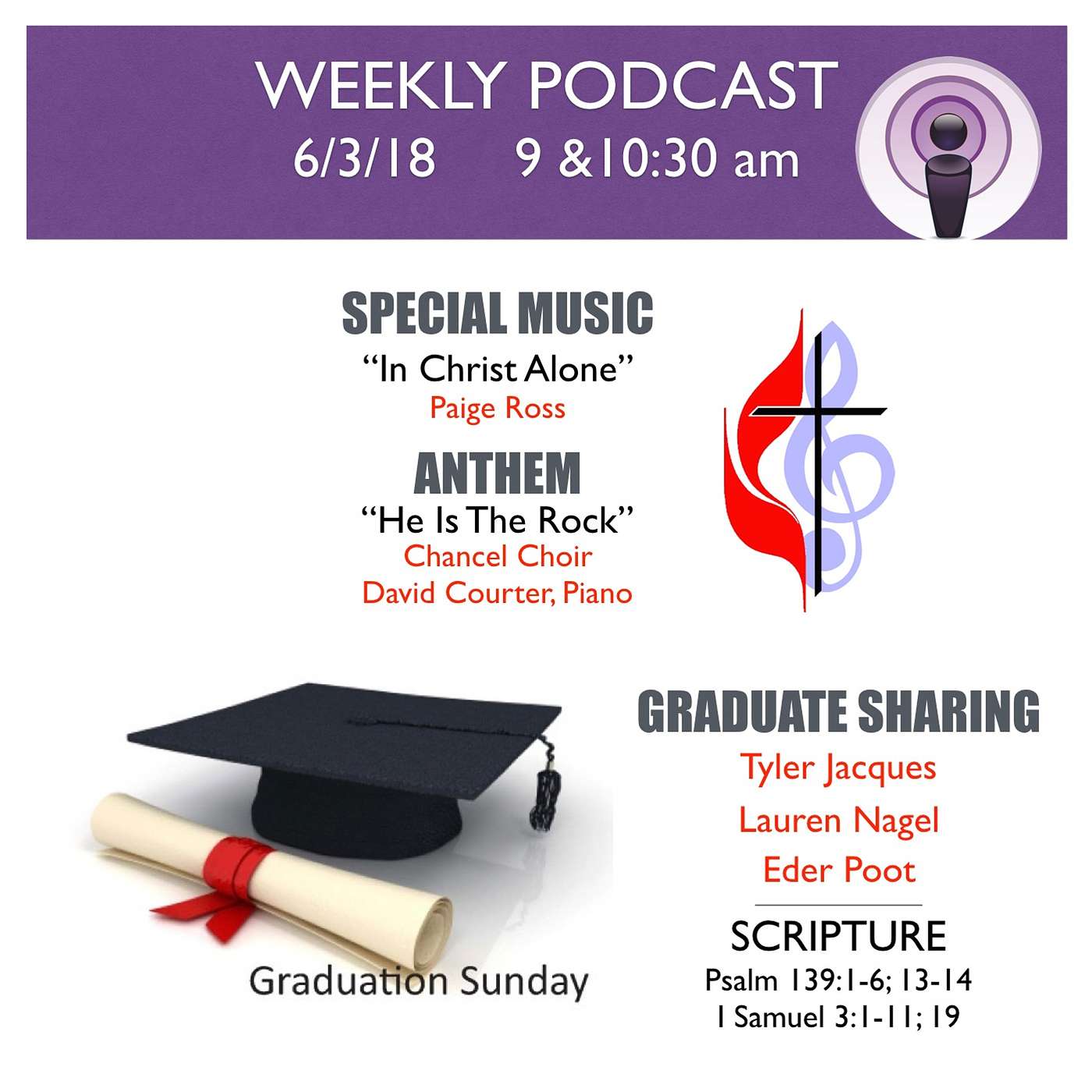 [00:00] Special Music: "In Christ Alone" - Paige Ross, Soloist (Keith Getty)[03:30] Scripture: Psalm 139:1-6; 13-14; I Samuel 3:1-11;19[06:29] Anthem: "He Is The Rock" - Chancel Choir, David Courter, Piano(Michael Barrett)[09:16] Graduate Sharing - Tyler Jacques, Lauren Nagel, Eder Poot