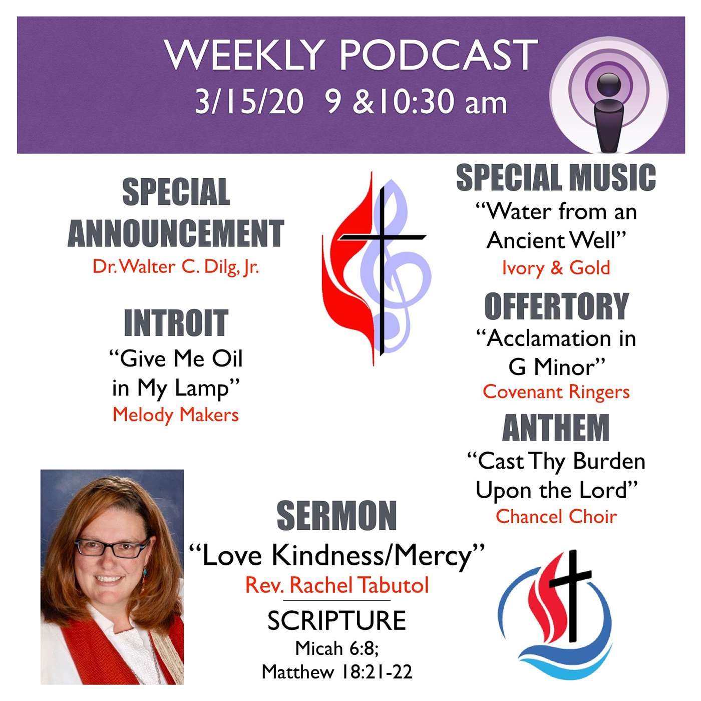 [00:00] Special Announcement: - Dr. Walter C. Dilg, Jr.[06:07] Introit: "Give Me Oil In My Lamp" (arr. V. Hancock Wright) - Melody Makers[08:46] Special Music: "Water from an Ancient Well" (Abullah Ibrahim) - Ivory & Gold[17:59] Scripture: Micah 6:8; Matthew 18:21-22[19:15] Offertory: "Acclamation in G Minor" (Karen Thompson) - Covenant Ringers[22:08] Anthem: "Cast Thy Burden Upon the Lord" (B. Harlan) - Chancel Choir[26:15] Sermon: "Love Kindness/Mercy" - Rev. Rachel Tabutol