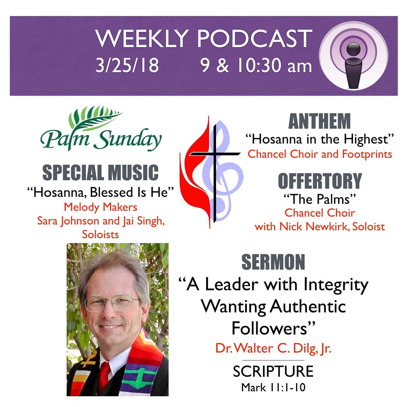 Palm Sunday(00:00) Special Music: "Hosanna, Blessed Is He" - Melody Makers (Composer: Cindy Berry)(02:19) Scripture: Mark 11:1-10(03:11) Anthem: "Hosanna in the Highest" - Chancel Choir and Footprints (Composer: Craig Courtney)(07:01) Offertory: "The Palms" - Chancel Choir with Nick Newkirk, Soloist (Composer: Gabriel Faure)(11:02) Sermon: "A Leader with Integrity Wanting Authentic Followers" - Dr. Walter C. Dilg, Jr.