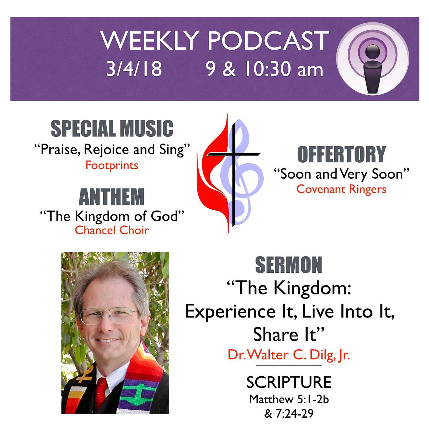 (00:00) Special Music: "Praise, Rejoice and Sing" - Footprints(02:35) Scripture: Matthew 5:1-2b & 7:24-29(03:55) Anthem: "The Kingdom of God" - Chancel Choir(06:06) Offertory: "Soon and Very Soon" - Covenant Ringers(10:10) Sermon: "The Kingdom: Experience It, Live Into It, Share It" - Dr. Walter C. Dilg, Jr.