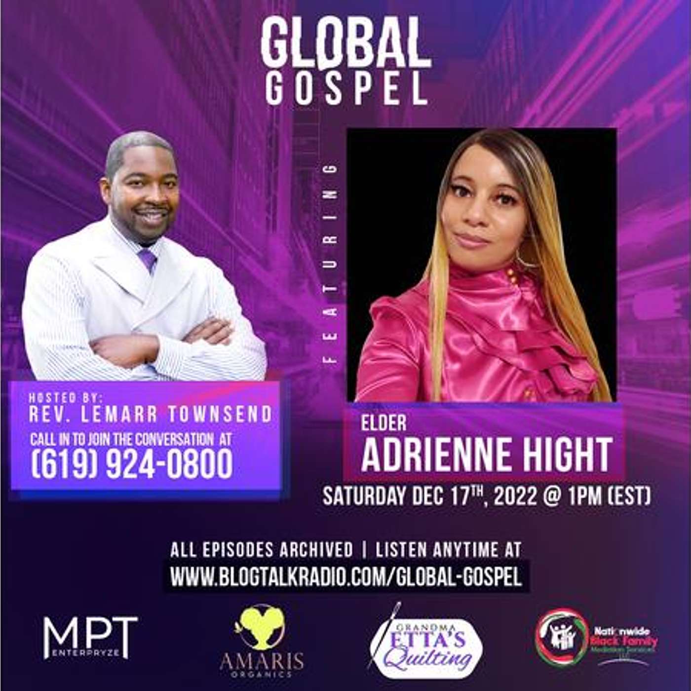Saturday, December 17, 2022 - Join Global Gospel as we talk about the power of prayer. Our special guest is Elder Adrienne Hight. Elder Adrienne Hight is an anointed woman of God. She is a Gospel preacher, teacher, intercessor, educator and entrepreneur. Stay tuned and be blessed!