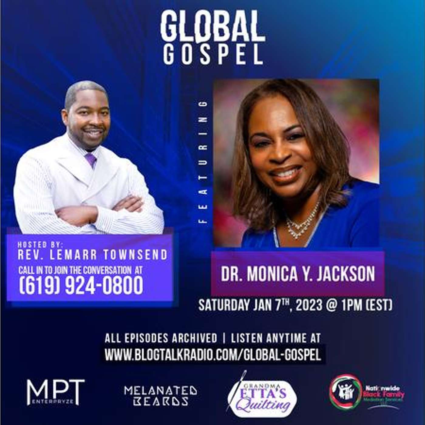 Saturday, January 7, 2023 - Join Global gospel as we share with Dr. Monica Y. Jackson, the author of "WOUNDS OF WISDOM". Wounds hurt, wounds can be deep, wounds can destroy, wounds can heal, and wounds can bring wisdom. In addition to be an accomplished author Dr. Jackson is an educator, entrepreneur, professor, friend, and mother. She has not only gained wisdom but she shares wisdom. Stay tuned and be blessed.