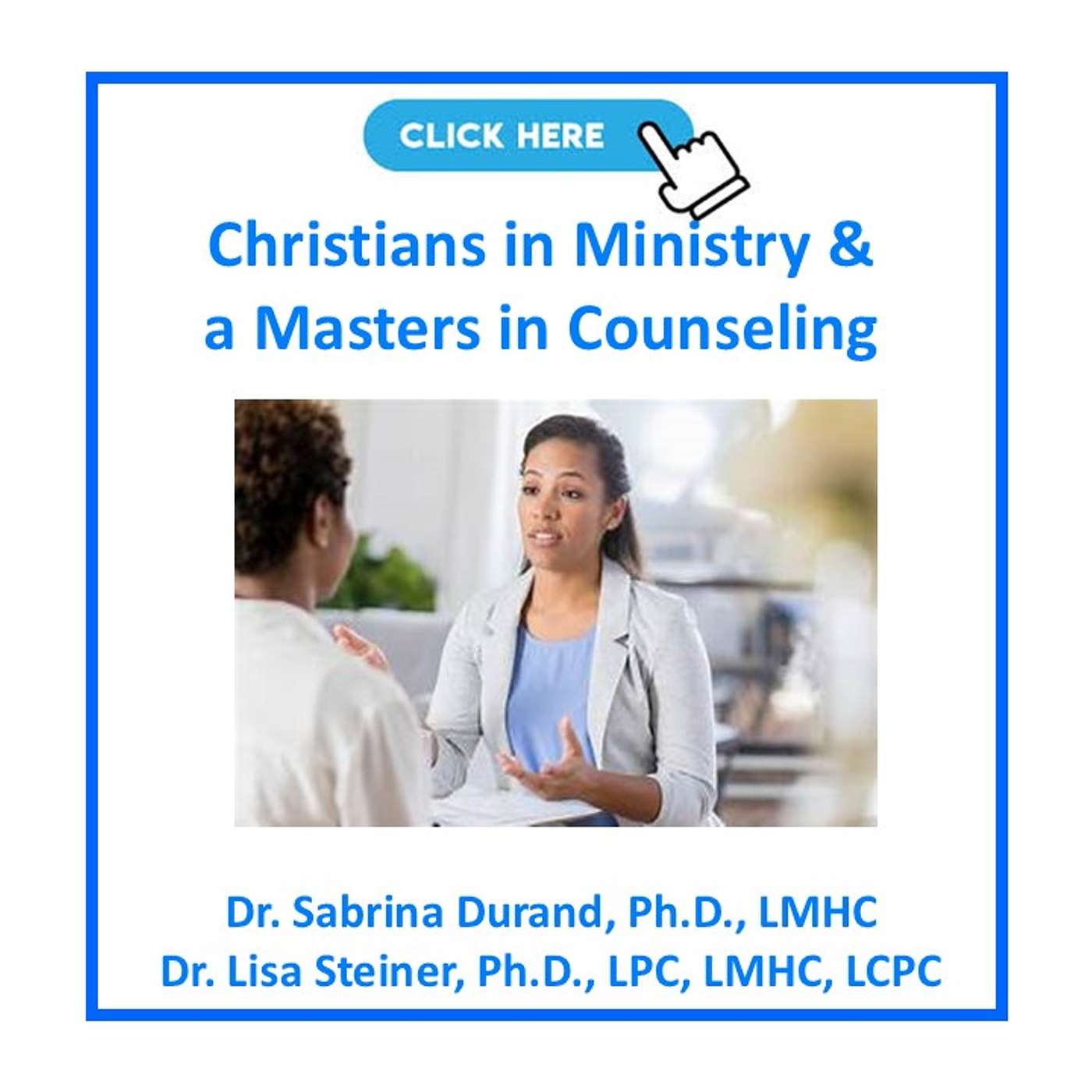 Dr. Steiner, Ph.D., LPC, LMHC, LCPC has a dialogue with Dr. Sabrina Durand, Ph.D., LPC, LMHC on the benefits of Christians in Ministry pursuing a Masters in Counseling