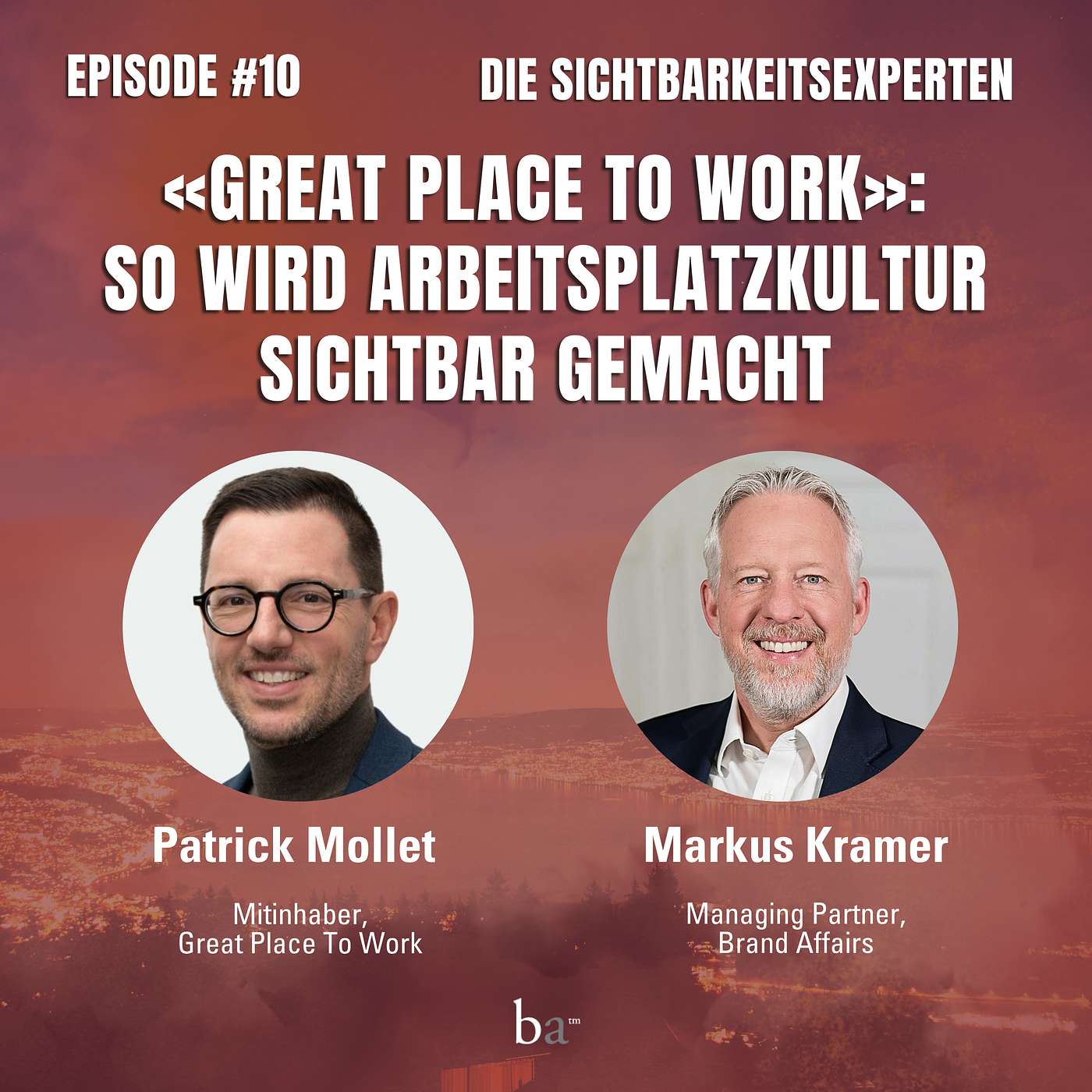 In der zehnten Episode des Sichtbarkeits-Podcasts von Brand Affairs spricht Markus Kramer, Managing Partner, mit Patrick Mollet, Mitinhaber von Great Place To Work, über die Bedeutung von Arbeitsplatzkultur. Dabei streifen sie die wichtigsten Punkte wie Sinnhaftigkeit, Werte und Verbesserungspotenzial in Unternehmenskulturen.