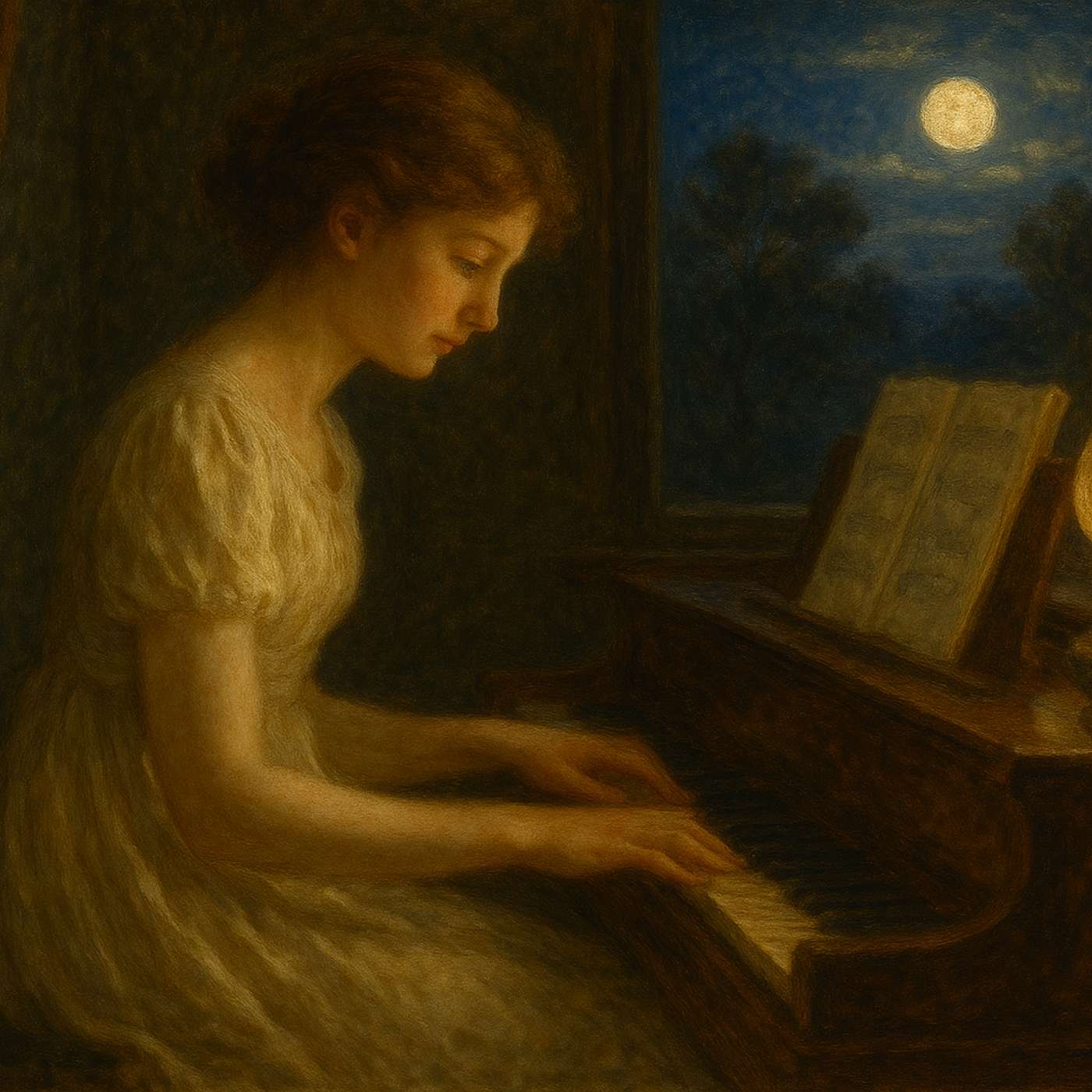 「夜曲」這種體裁源自義大利文 notturno,原本與夜間儀式相關,後來發展為以夜晚情緒為靈感的抒情鋼琴作品。Clara 的這首夜曲在平靜柔和的氛圍中,透過雙手節奏的層次對比,營造出如時間漣漪般的細膩流動;中段的獵歌式節奏與小調色彩又增添了戲劇性。