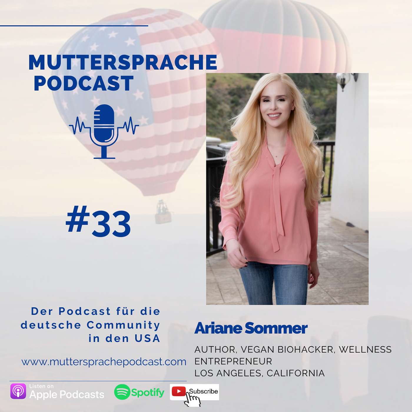 Autorin, Vegan Biohackerin, Wellness Entrepreneur und noch viel viel mehr ist unser Gast im Muttersprache Podcast - Ariane Sommer. Als Diplomaten Tochter wuchs Ariane in Sierra Leone, Indien, Spanien, den USA und UK auf. Sie besuchte ein internationales Internat und studierte Politik Wissenschaften an der Freien Universität Berlin. Vor 16 Jahren zog sie der Liebe wegen in die USA und bautet sich hier ein Universum bestehend aus verschieden Unternehmen z.B. ein Vitamine Spray, auf. Eines ihrer Herzensprojekte ist ihr Lifestyle Blog - AVAP.life / As Vegan As Possible und ihr Super Humanize Podcast mit inspirierenden Persönlichkeiten, die das Thema Biohacking verkörpern. Was das genau ist erklärt Ariane uns in diesem Podcast. Die Autorin und Kolumnistin Ariane engagiert sich besonders für den Tierschutz und hat neben vielen Artikeln u.a in der Welt, Zeit, taz und der deutschen Vogue geschrieben und außerdem ein Buch und eine Sammlung von Kurzgeschichten veröffentlicht. Ariane war ebenso zu Gast im DU und Ich in LA Podcast hier kannst auch mehr über Arianes Lebensweg erfahren.