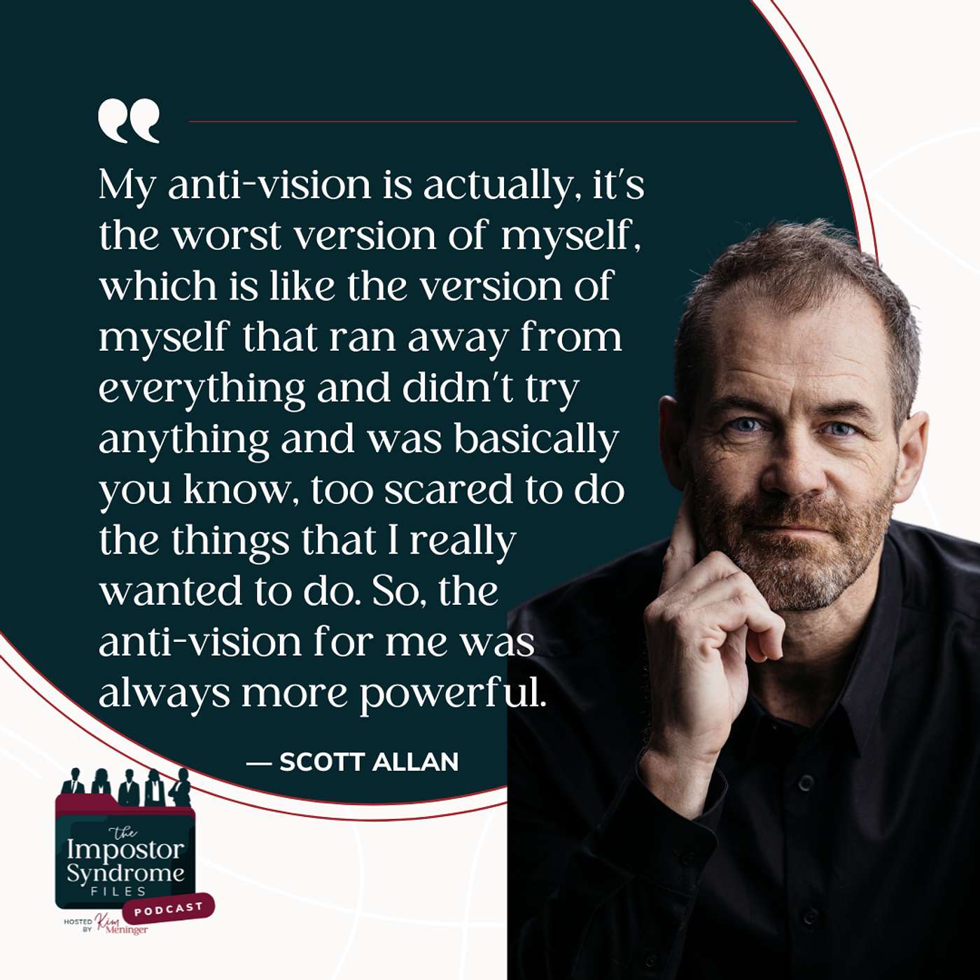 In this episode of the Impostor Syndrome Files, we talk about the power of an anti-vision. Visions can be inspiring but they’re often not powerful enough to break through fear. My guest this week, author and coach Scott Allan, talks about how he uses an anti-vision to push himself out of his comfort zone and face his fears. We also talk about the importance of reminding ourselves that confidence follows action, celebrating small wins and recognizing when we might be a little too comfortable.